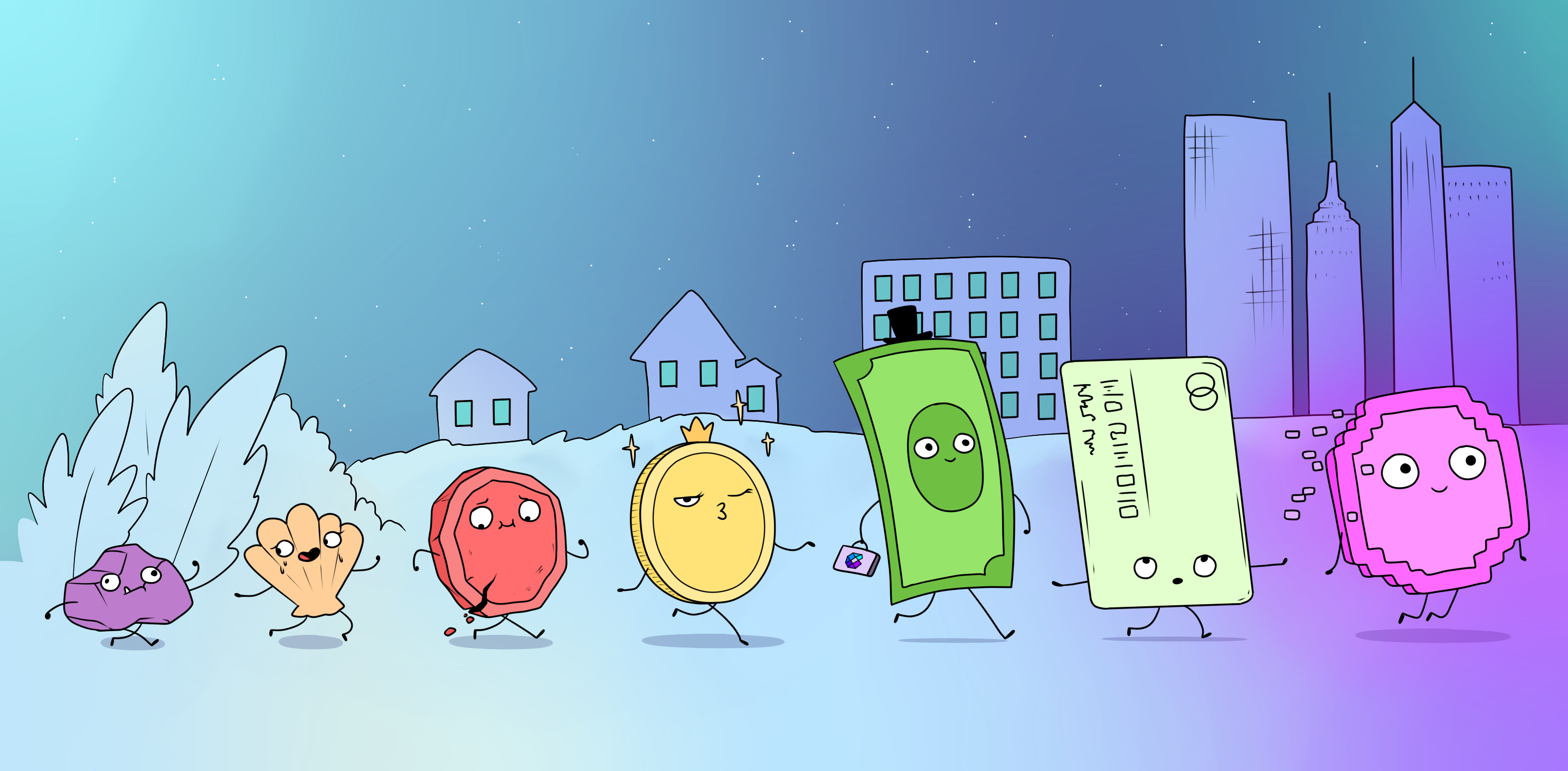 Книжните банкноти постојат релативно кратко време. Илјадници години претходно, луѓето разменувале копја за вазни, глина за ориз, коза за крава. Главниот проблем кој со себе го носеле овие размени на производи е што нивната вредност зависела од околностите околу колку нужна била потребата на едната или другата страна. Голем дел од луѓето порано морале да чекаат долго време за да најдат некој кој му треба цигли за да купи волна, но таков купец долго време немало.