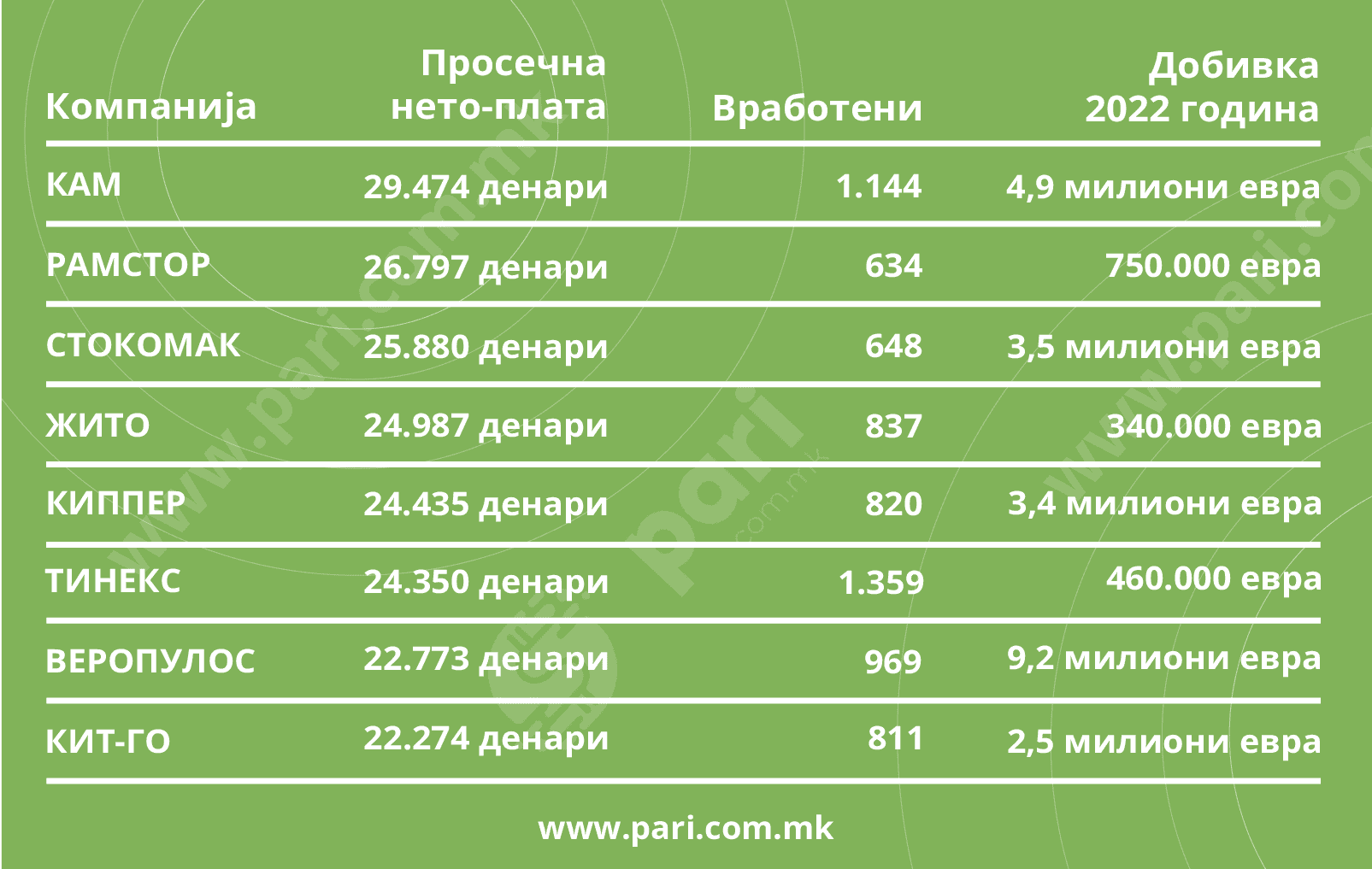 Податоците откриваат дека Кит-го, кој лани остварил профит од 2,5 милиони евра, давал најмали плати. Таму просечната нето-плата со додатоците била 22.274 денари. Синџирот вработува 811 работник.
