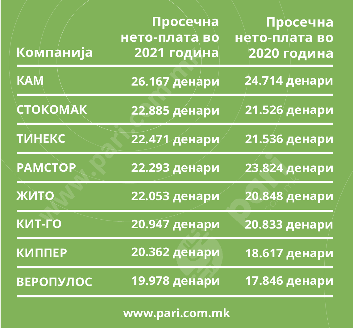 Податоците покажуваат дека и во претходните години Кам е работодавачот од трговскиот сектор кој давал најголеми плати. Тој лани го зголемил просекот за околу 3.000 денари во однос на 2021 година. За минатата година може да се забележи значително подобрување кај Кипер. Просечната плата се зголемила од 20.362 денари во 2021 година, на 24.435 денари во 2022 година. Позначајно зголемување имало и кај Рамстор, каде просекот предминатата година бил 22.293 денари за лани да скокне на 26.797 денари.
