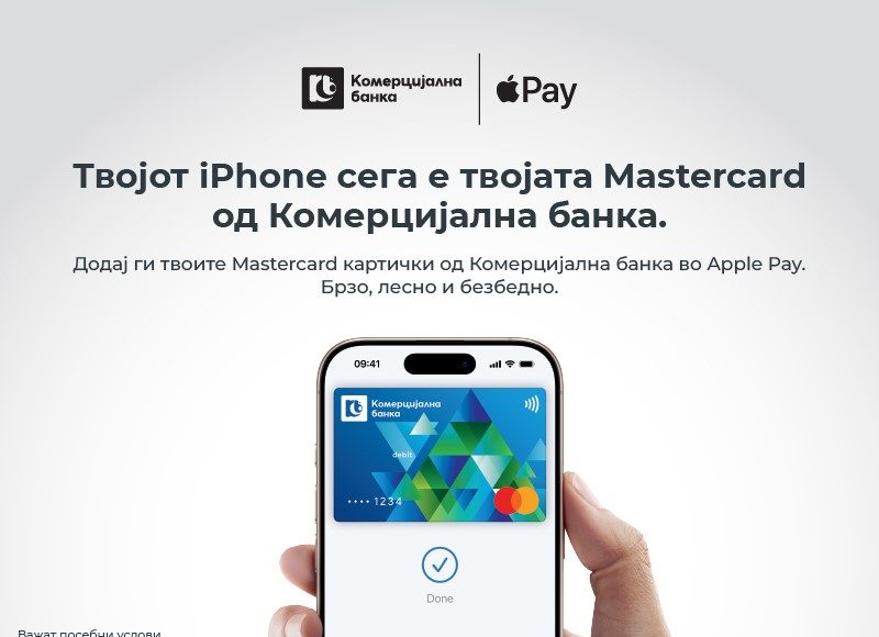 За да ги користиш бенефитите од Apple Pay, треба да ја преземеш бесплатната апликација Apple Wallet и да ги додадеш во неа твоите картички од Комерцијална банка. Постапката може да ја започнеш и преку апликацијата мБанка. Може да додадеш неограничен број картички, а потоа да бираш со која ќе плаќаш.