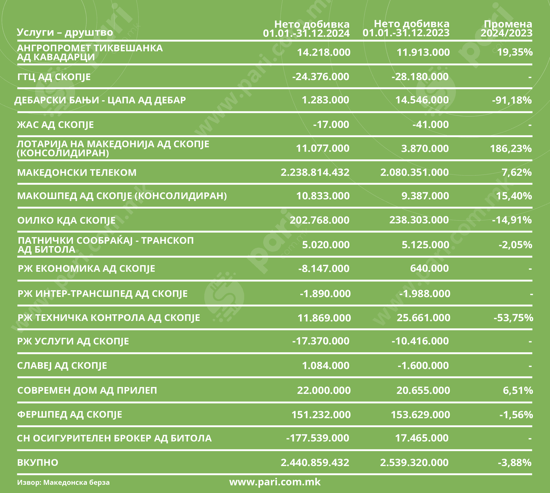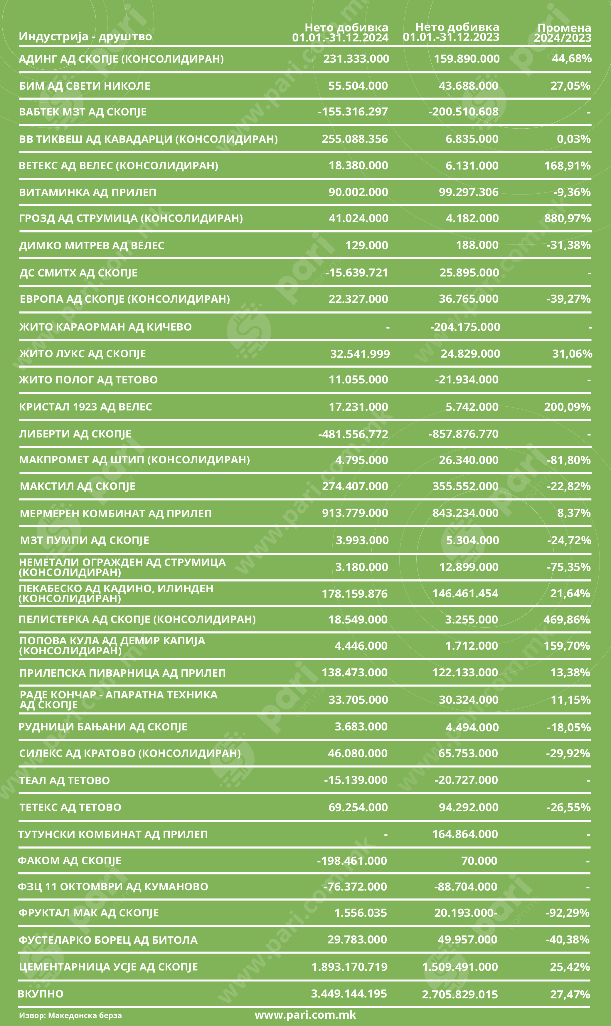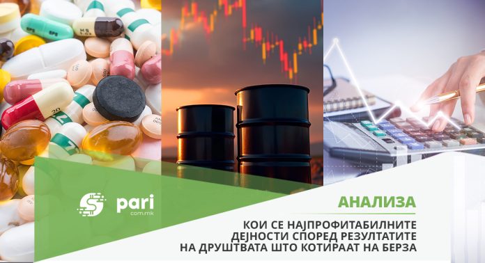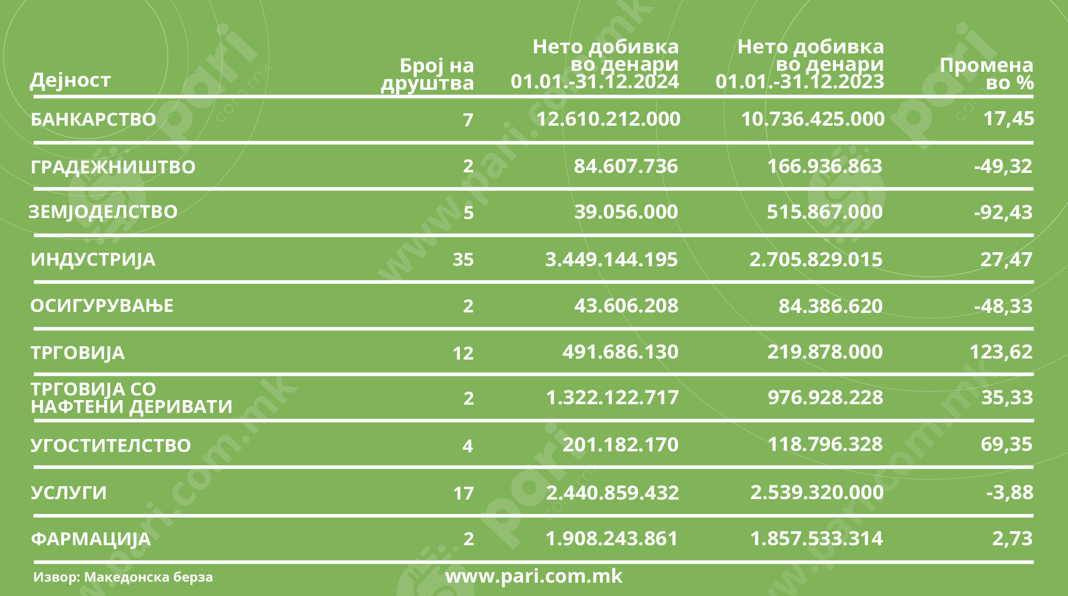 Пари ги анализираше податоците од официјалниот берзански преглед на финансиските резултати постигнати лани од јануари до декември. Забележливо е дека од десетте дејности во кои спаѓаат котираните друштва, кај четири има пад на вкупната добивка. Најголемото осипување е во земјоделството, од -92,43%.