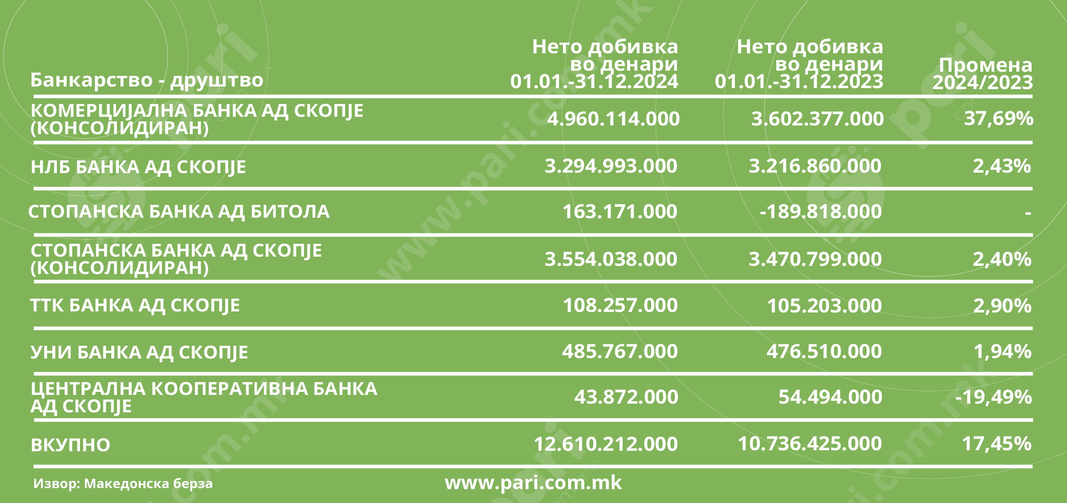 БАНКИ – Банкарските акции се во врвот на акционерскиот интерес, а зошто е тоа така, покажуваат резултатите. Од седумте банки со чии акции се тргува на Берзата, само кај една има пад на профитот. Станува збор за минус од 19,49% регистриран во работењето на Централна кооперативна банка, што изразено низ бројки значи пад од 886 илјади евра (2023) на 713,3 илјади евра (2024). Другите четири банки имаат зголемување на добивката која се движи во рамките од 1,94% до 2,90%. Таа рамка е тесна за Комерцијална банка и растот од 37,69%. А, не ја опфаќа ниту Стопанска банка Битола, која за една година нaправи исчекор од шест милиони евра и од загубата во 2023, влезе во плус и со добивка ја заврши 2024.
