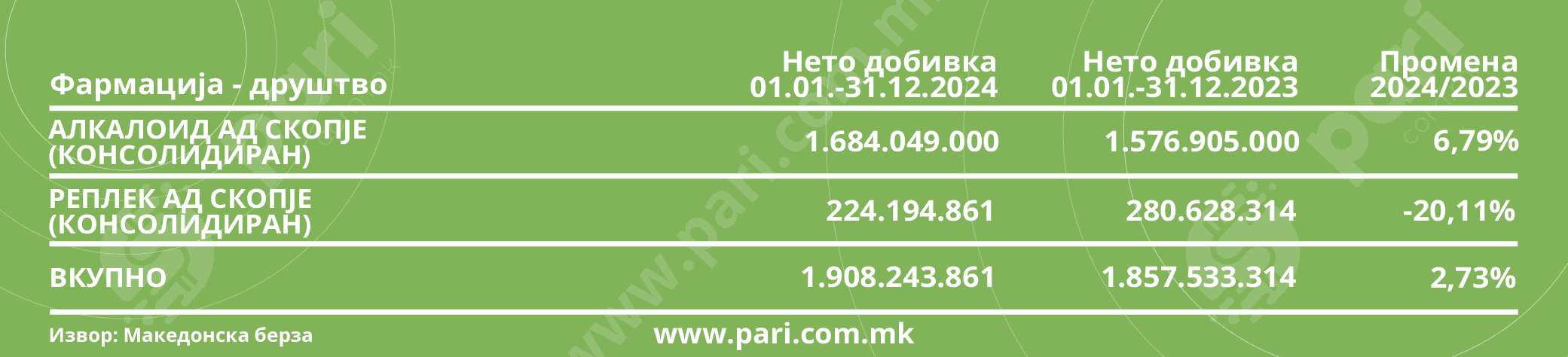 ФАРМАЦИЈА – Во текот на минатата година, најголемата македонска фармацевтска куќа Алкалоид одработи и заработи чисти 27,4 милиони евра, при што добивката е повисока за безмалку 6,8%. Овој резултат има влијание врз промената кај заедничката добивка во оваа дејност, во која вториот сочинител е Реплек. Меѓутоа, според консолидирниот финансиски извештај, компанијата има пониска добивка за над 20%.