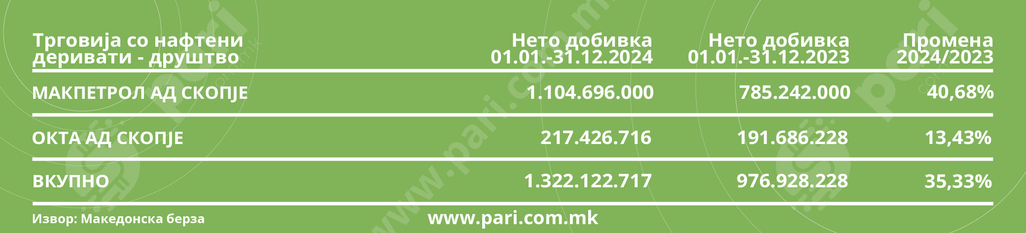 ТРГОВИЈА СО НАФТЕНИ ДЕРИВАТИ – Макпетрол и Окта се двете компании од оваа дејност, чии акции се тргуваат на Македонска берза. Нивниот лански заеднички профит изнесува 21,5 милиони евра. Тоа е за 35,33 насто повеќе споредено со годината пред тоа. Нивните добивки се зголемени, на Макпетрол за 49,68, а на Окта за 13,43 проценти. Дека Макпетрол е најголемиот дистрибутер на горива во земјава, укажува профитабилноста, која за 2024 година е нешто под прагот на 18 милиони евра.