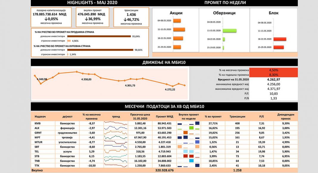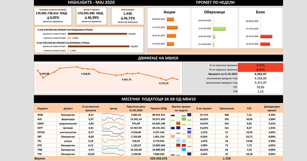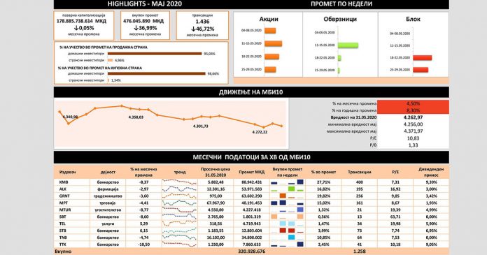 Параметрите за промет по недели, главните “highlights”, како и 10те најтргувани компании во Македонија кои котираат на берзата, за месец Мај, 2020: