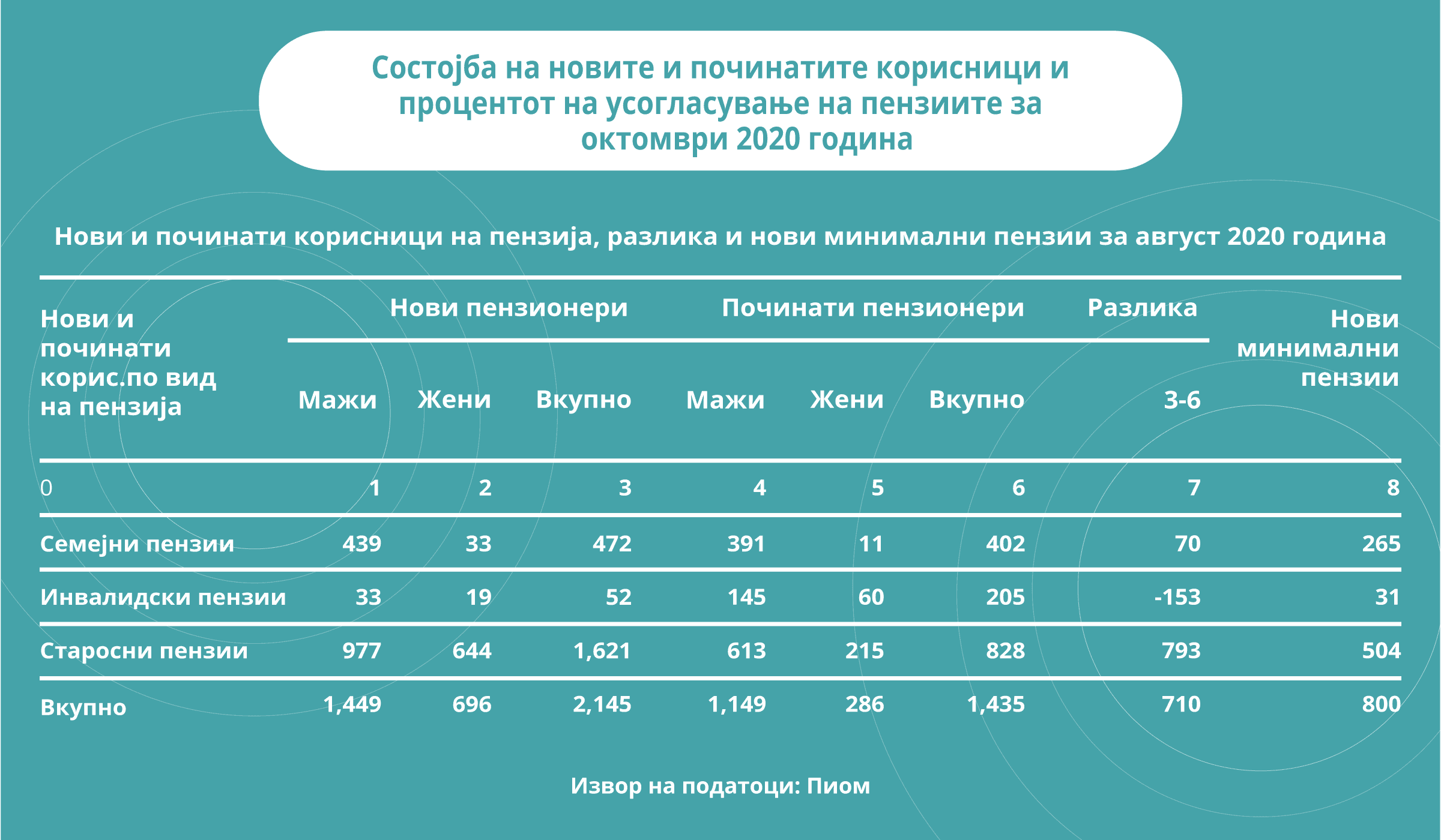Само во месец октомври имало нови 2.145 пензионери на списокот на ПИОМ. Од нив најголем дел биле мажи 1.449 а остатокот жени и најголем дел, 1.621 се стекнале со правото на старосна пензија. Од друга страна пак, имало 1.435 починати пензионери, од кои 1149 биле мажи.