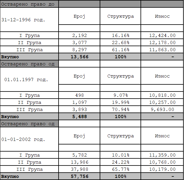 Податоците покажуваат дека од 325.794 пернзионери најмногу 324.518 се стекнале со право на пензија по работен основ. Други 1.140 стекналеправо на пензија како поранешни воени лица, а само 136 биле земјоделци и по тој основ оствариле право на пензија.