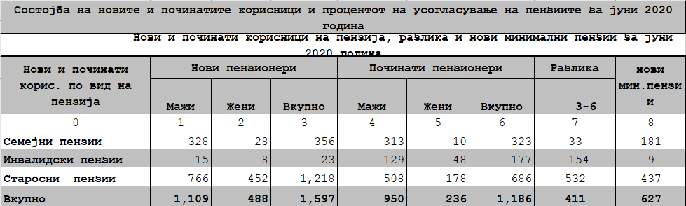 Податоците на Фондот за пензиско за јуни годинава покажуваат дека само во месец јуни имало нови 1.597 пениоери на списокот на ПИОМ. Од нив најголем дел биле мажи 1.109 а остатокот жени и најголем дел, 1.218 се стекнале со правото на старосна пензија. Од друга страна пак, имало 1.186 починати пензионери, од кои 950 биле мажи.