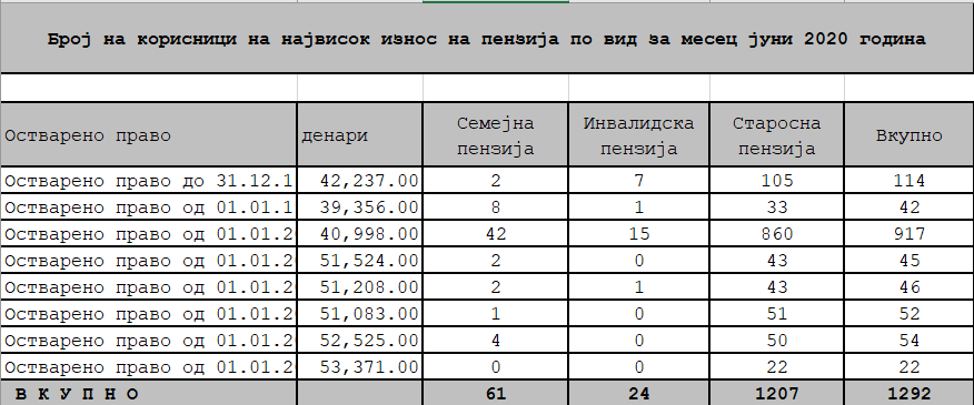 Најнизок износ на пензија земале 76.810 пензионери, од кои 57.756 пензионери за остварено право од 01.01.2002 година до денешен датум. Останатите 19.054 се за оставрено право до 1996 и за периодот 1997- 2002 година. Најнискиот износ на пензија за најголемата група на корисници на ова право се движи од 10.179 денари до 11.359 денари, во зависност од групата на која што припаѓаат.