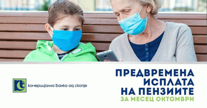 Комерцијална банка АД Скопје ќе започне со исплата на пензиите за октомври од вторник, 27.10.2020 година. Пензионерите кои имаат активна дебитна картичка со својата пензија ќе може да располагаат од вторник и ќе може да ја подигнат на банкомат или да ја користат за безготовинско плаќање.
