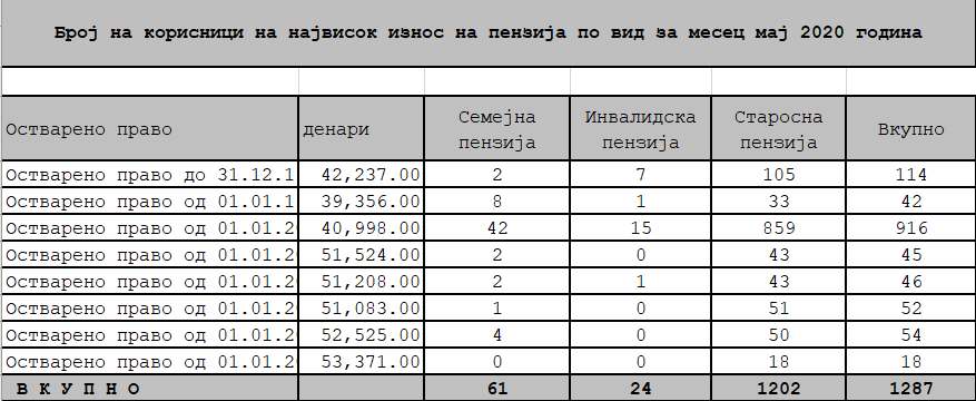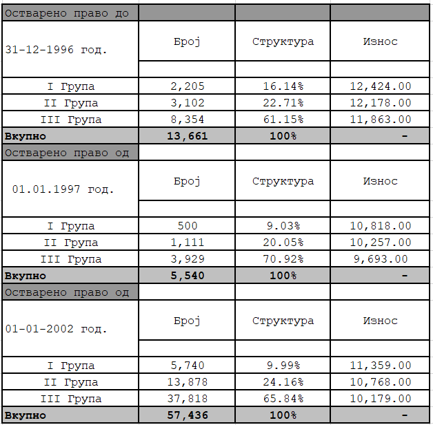 Најнизок износ на пензија земале 76.637 пензионери, од кои 57.436 пензионери за остварено право од 01.01.2002 година до денешен датум. Останатите 19.201 се за оставрено право до 1996 и за периодот 1997- 2002 година. Најнискиот износ на пензија за најголемата група на корисници на ова право се движи од 10.179 денари до 11.359 денари, во зависност од групата на која што припаѓаат.