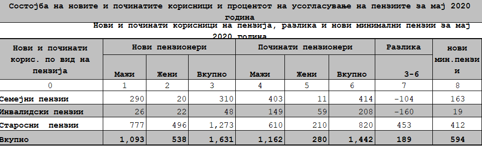Податоците на Фондот за пензиско за мај годинава покажуваат дека само во месец мај имало нови 1.631 пениоери на списокот на ПИОМ. Од нив најголем дел биле мажи 1.093 а остатокот жени и најголем дел, 1.273 се стекнале со правото на старосна пензија. Од друга страна пак, имало 1.442 починати пензионери, од кои 1.162 биле мажи.