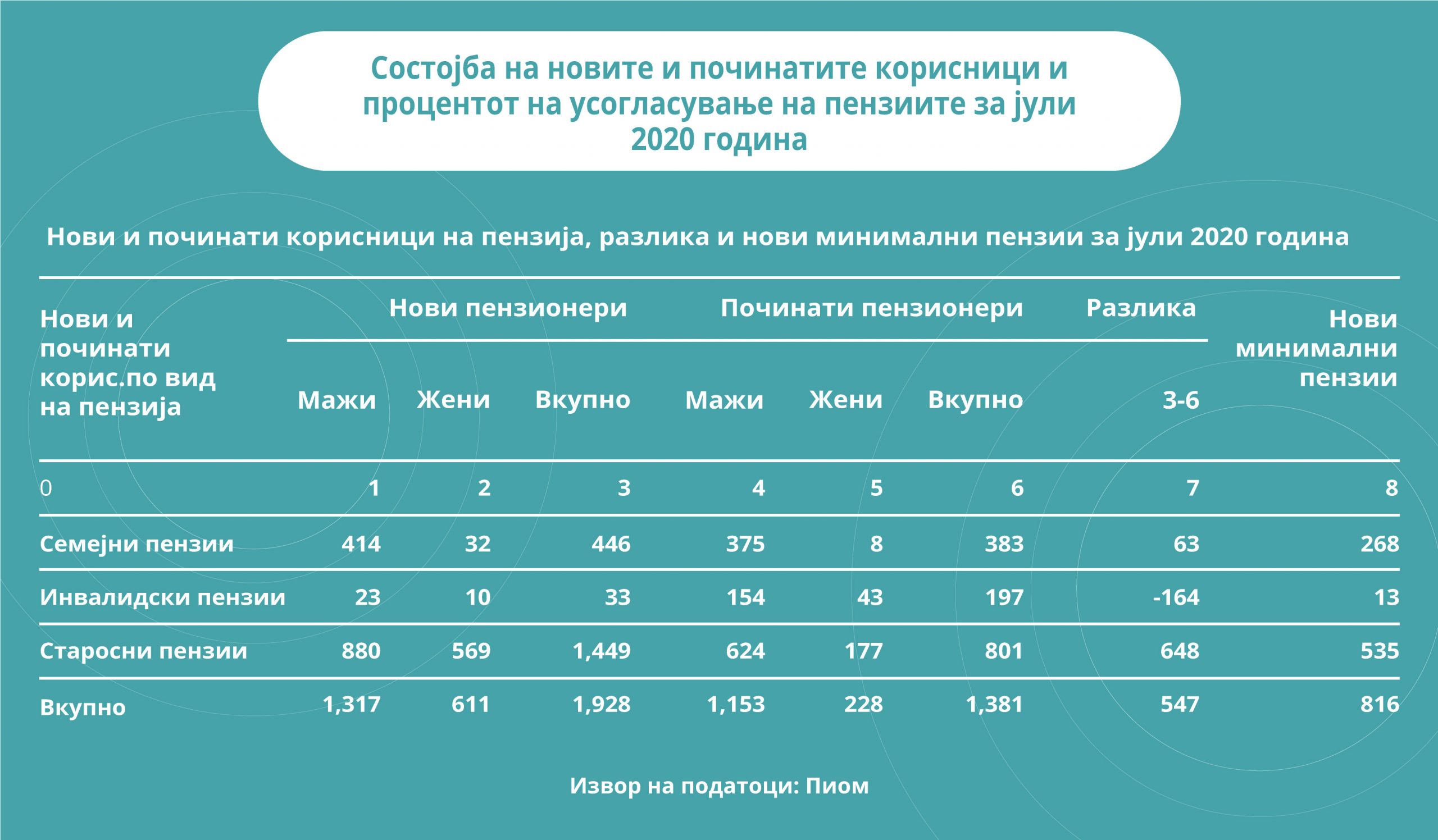 Само во месец јули имало нови 1.928 пениоери на списокот на ПИОМ. Од нив најголем дел биле мажи 1.317 а остатокот жени и најголем дел, 1.449 се стекнале со правото на старосна пензија. Од друга страна пак, имало 1.381 починати пензионери, од кои 1153 биле мажи.