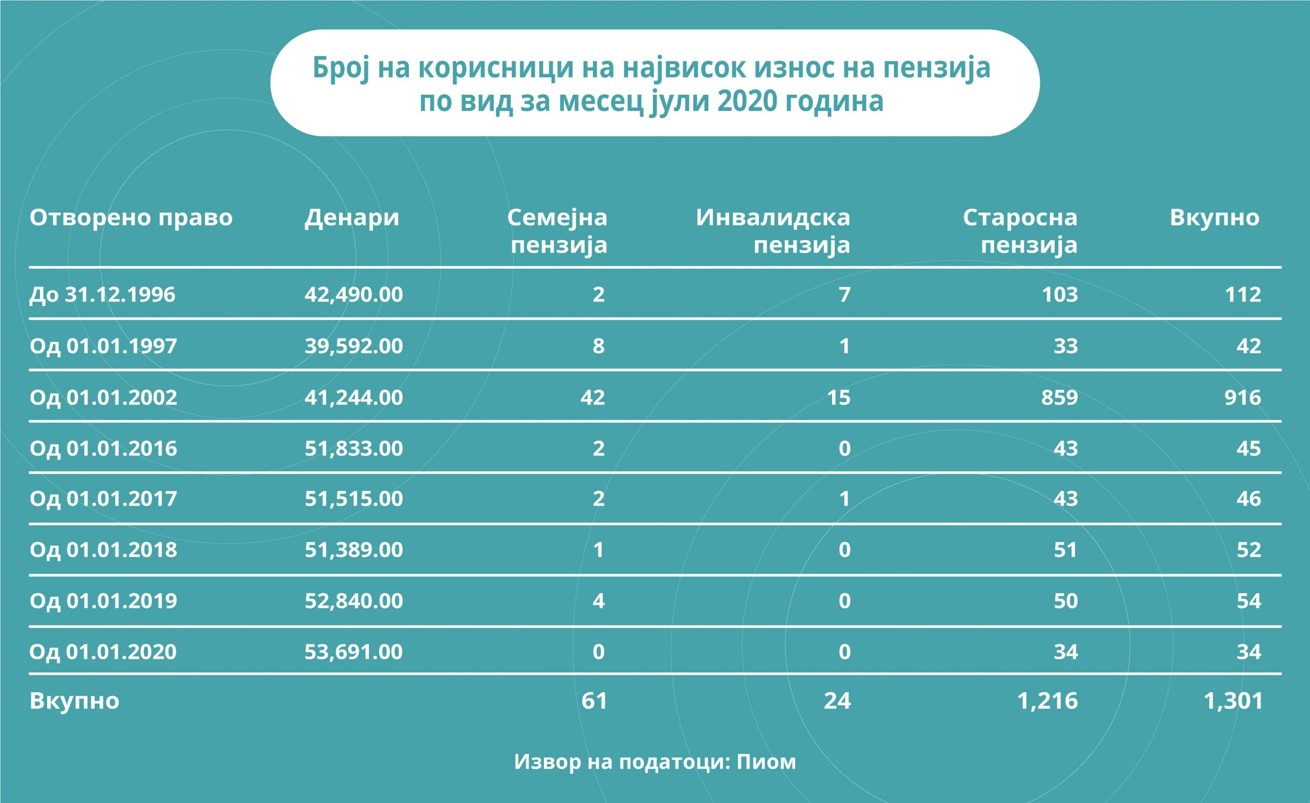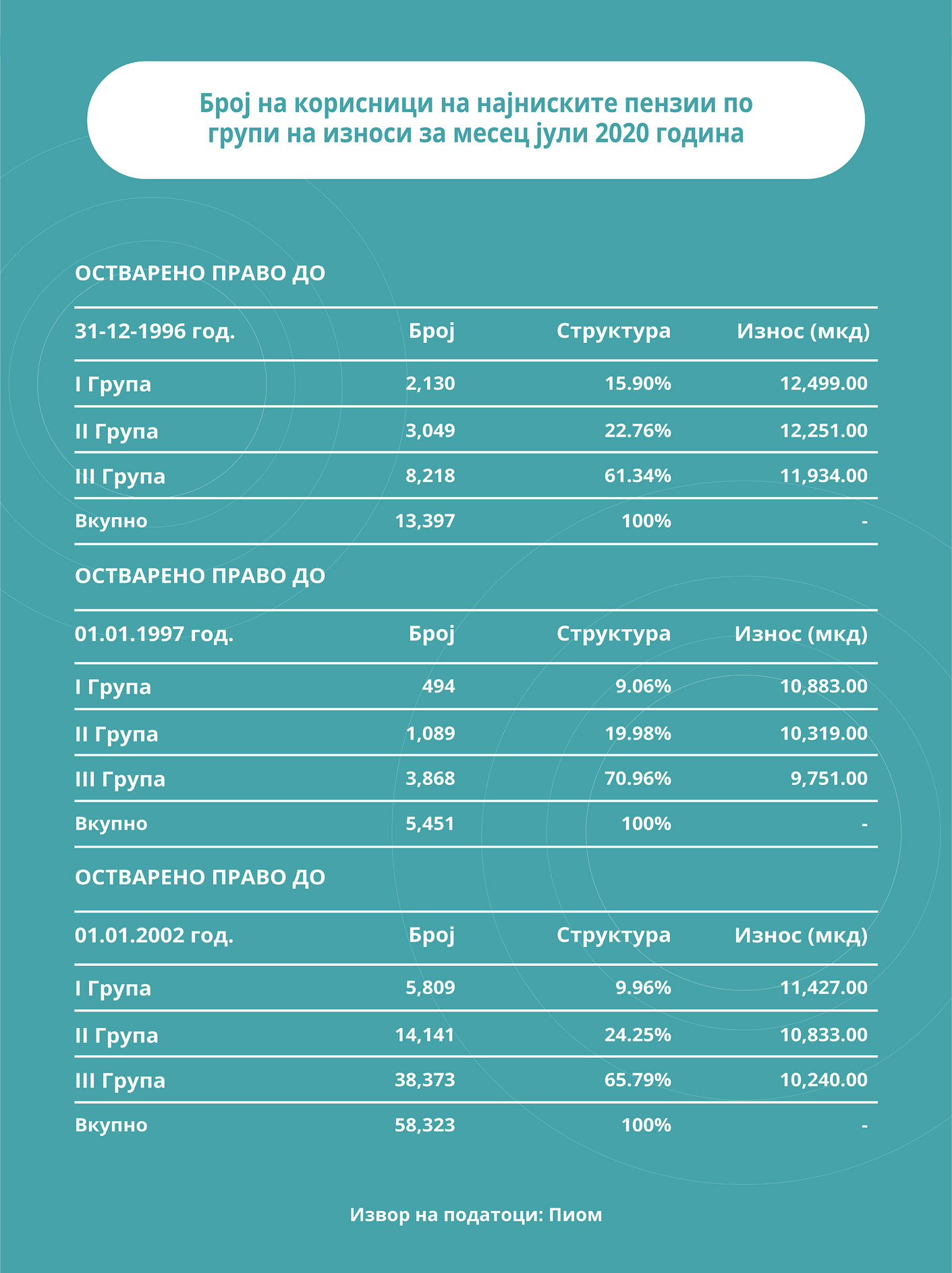 Најнизок износ на пензија земале 77.171 пензионери, од кои 58.323 пензионери за остварено право од 01.01.2002 година до денешен датум. Останатите 18.848 се за оставрено право до 1996 и за периодот 1997- 2002 година. Најнискиот износ на пензија за најголемата група на корисници на ова право се движи од 10.179 денари до 11.359 денари, во зависност од групата на која што припаѓаат.