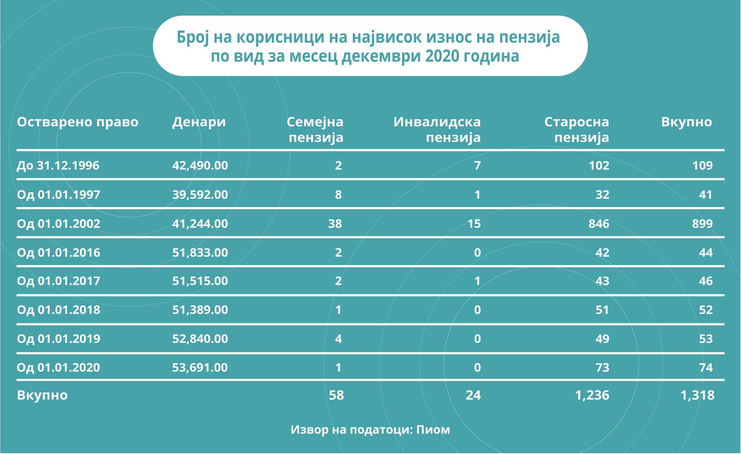 Во декември,минатата година имало 269 пензионери со пензија над 51.000 денари. 74 пензионери го земале највисокиот износ од 53.691 денари, покажуваат последните податоци на Фондот за пензиско. Или вкупно 1.318 пензионери во земјава се водат како пензионери со највисоки пензии, а распонот на нивните месечни примања по основ на пензија е од 39.592 до 53.691 денари во зависност од годината кога го стекнале правото. Најголем дел или 899 се со пензија од 41.244 денари.