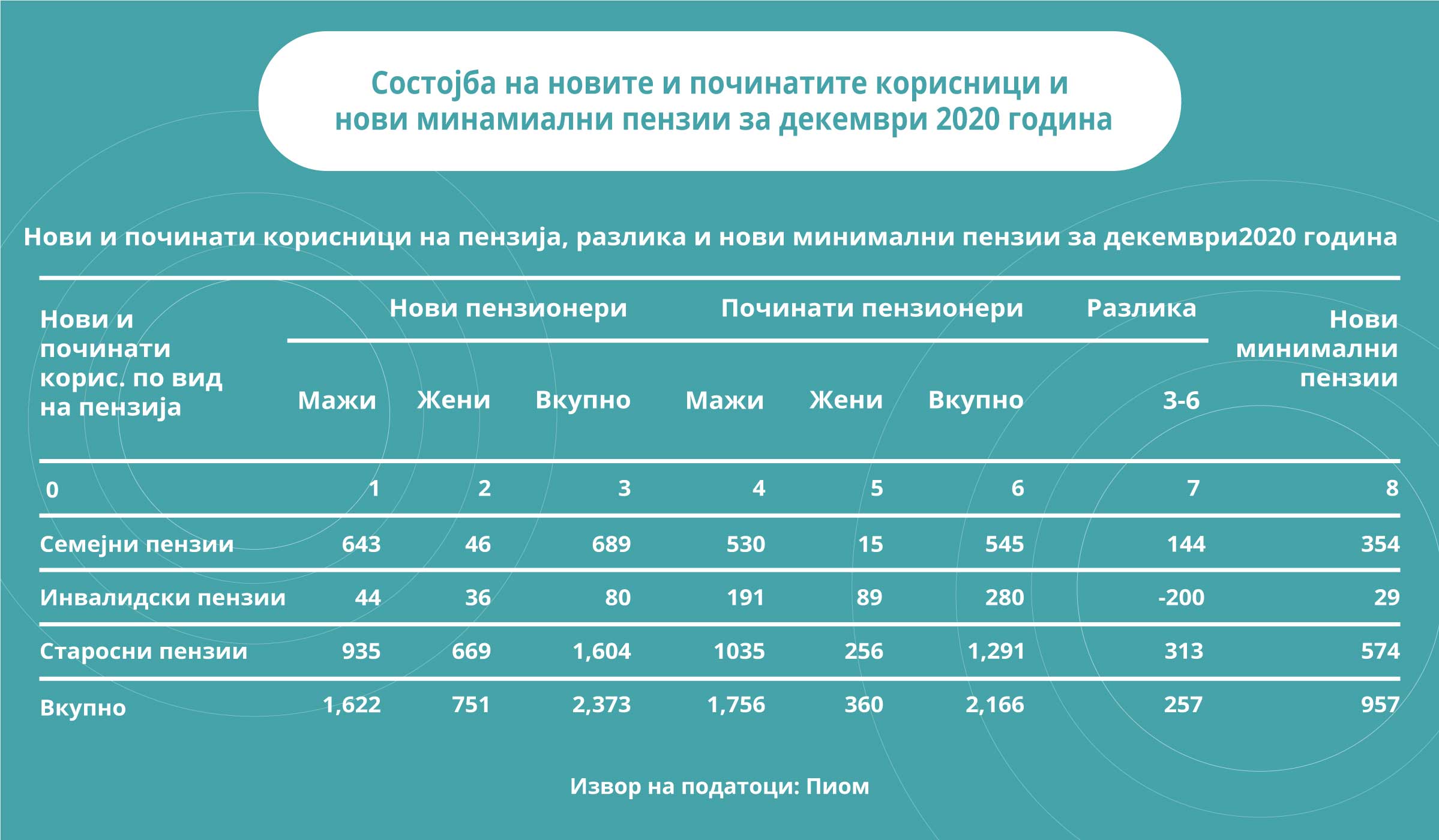 Само во месец декември имало нови 2.373 пензионери на списокот на ПИОМ. Од нив најголем дел биле мажи 1.622 а остатокот жени и најголем дел, 1.604 се стекнале со правото на старосна пензија. Од друга страна пак, имало 2.116 починати пензионери, од кои 1756 биле мажи.