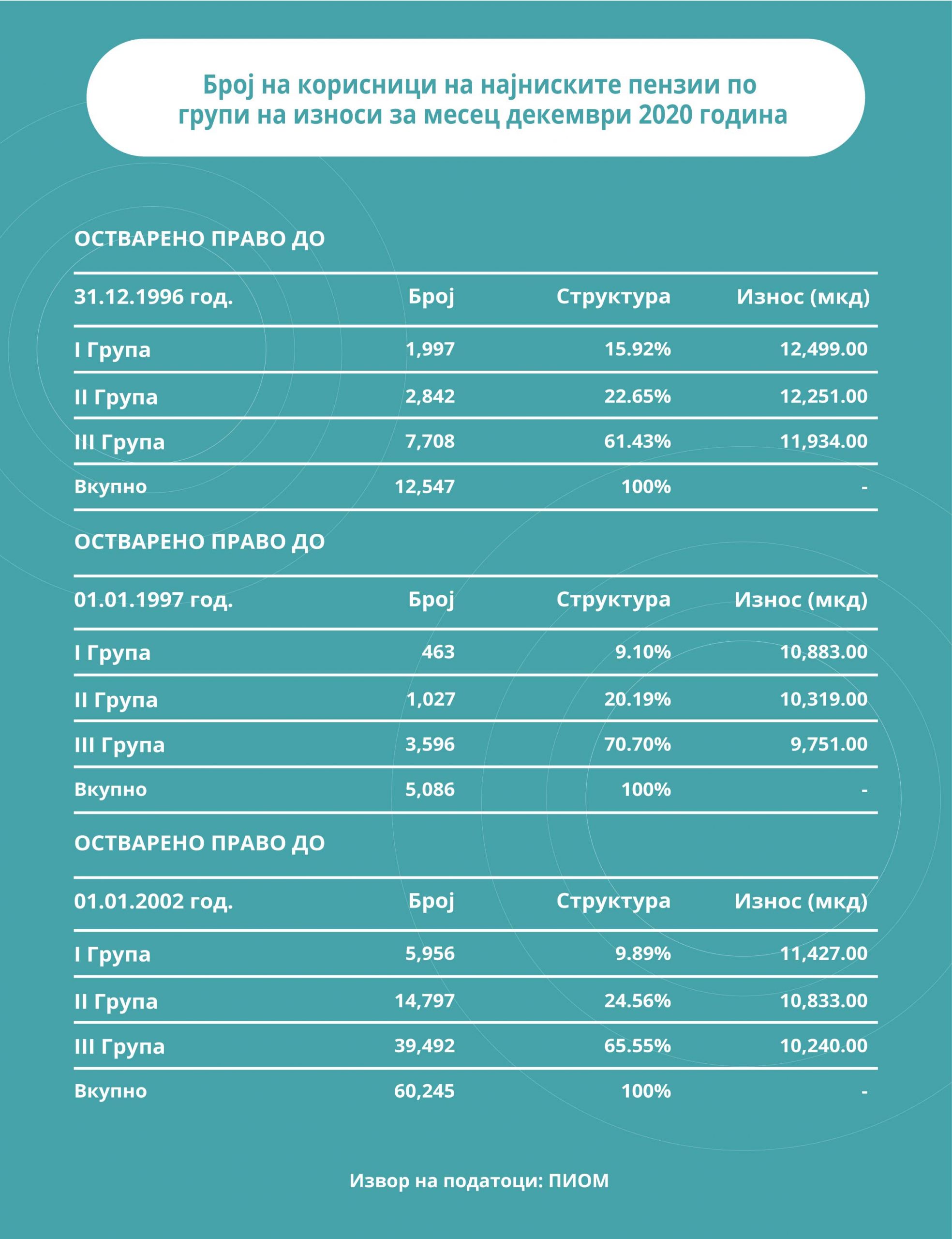 Најнизок износ на пензија земале 77.878 пензионери, од кои 60.245 пензионери за остварено право од 01.01.2002 година до денешен датум. Останатите 17.633 се за оставрено право до 1996 и за периодот 1997 – 2002 година. Најнискиот износ на пензија за најголемата група на корисници на ова право се движи од 9.751 денари до 12.499 денари, во зависност од групата на која што припаѓаат.
