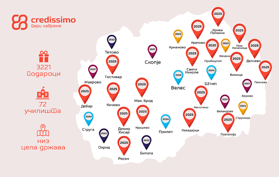 Вчера, 1.200 првачиња од различни населени места низ Македонија добија подароци со училиштен прибор во рамки на кампањата „Секогаш биди број 1“. Оваа кампања, Credissimo ја спроведува петта година. Станува збор за активност чија основна цел е да им се посака добредојде на првачињата во училишните клупи и да добијат материјали и прибор кои ќе им користат во образовниот процес. Оваа година, кампањата опфати најголем број градови, и тоа: Делчево, Радовиш, Гевгелија, Неготино, Кавадарци, Кичево, Гостивар, Македонски Брод, Ресен, Крива Паланка, Свети Николе, Виница, Кратово, Пехчево, Пробиштип, Македонска Каменица, Дебар, Крушево и Демир Хисар.
