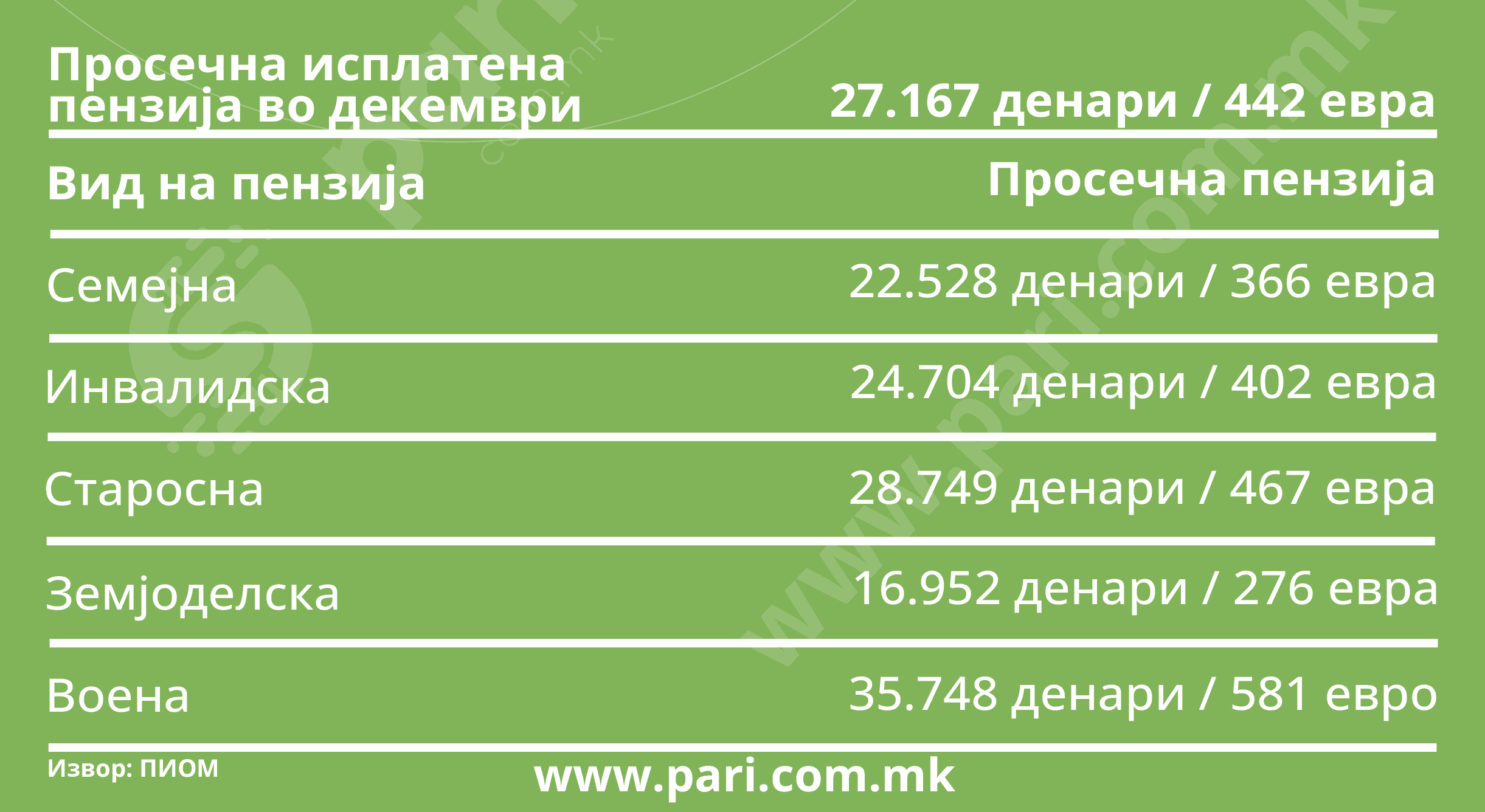 Просечната исплатена пензија во декември изнесува 27.167 денари. Притоа, старосната пензија е над овој просек – 28.749 денари (467 евра), а инвалидската под – 24.704 денари. Просекот на семејната пензија е 22.528 денари. Вообичаено, најниското просечно примање е на земјоделските пензионери, од 16.952 денари, а највисок просек имаат корисниците на воена пензија со 35.748 денари.