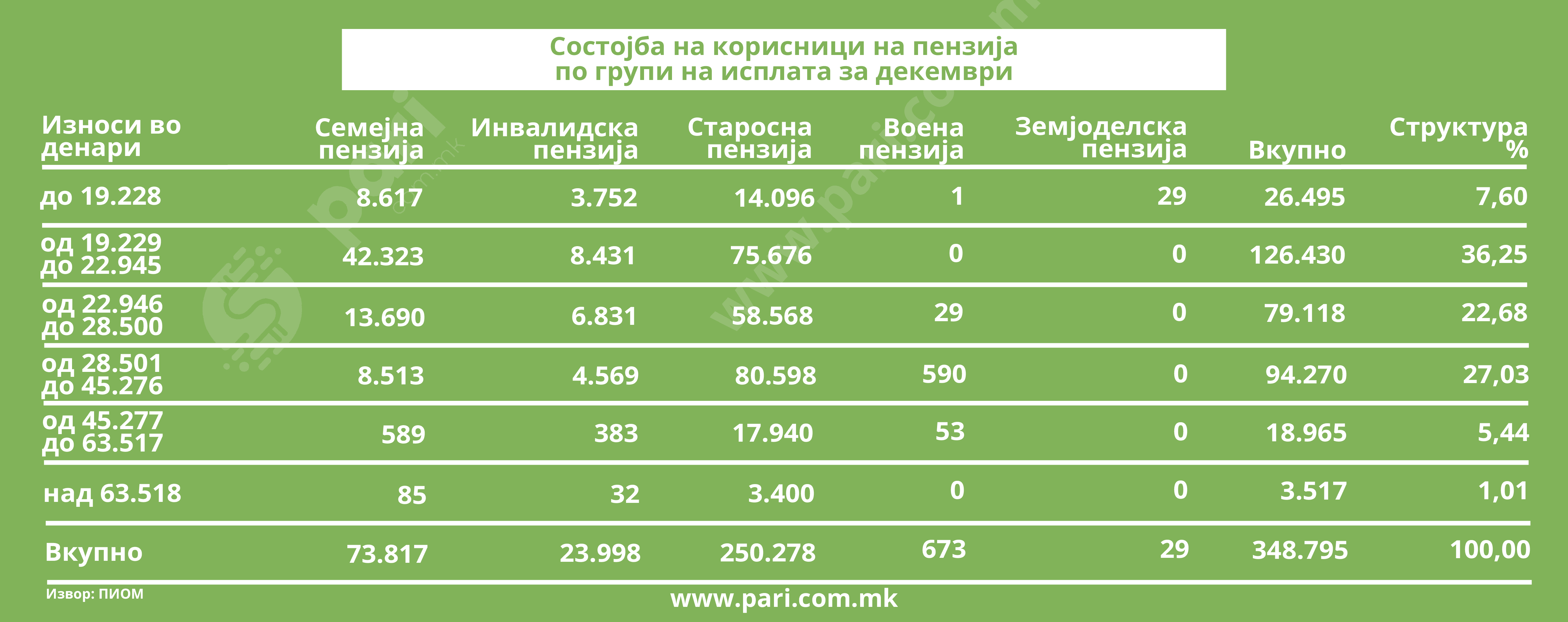 Тие покажуваат дека од вкупниот број корисници, 250.461 лице примаат старосна пензија, што претставува убедливо најголем сегмент. Семејна пензија користат 74.210 лица, додека инвалидска пензија примаат 24.124 корисници. По основ на воено и земјоделско право пензии примаат значително помал број лица – вкупно 702 корисници, што е симболичен удел во вкупната структура. Најголемиот дел од пензиите се остварени врз база на претходниот работен однос.