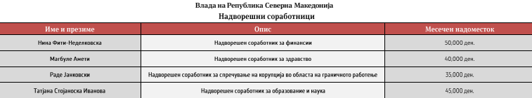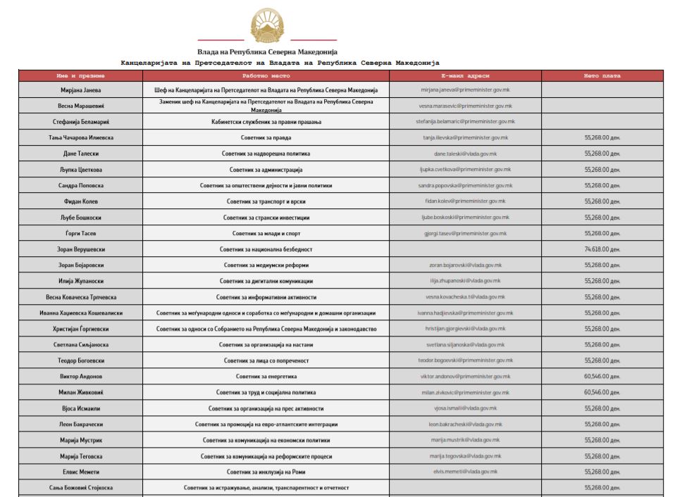 Засега, на листата објавени се платите само за 23 вработени советници во канцеларијата кај премиерот, а со највисока плата е поранешниот разузнавач Зоран Верушевски, кој како советник за национална безбедност добива 74.618 денари нето плата. По него следат Виктор Андонов советник за енергетика и Милан Живковиќ советник за труд и социјална политика со нето плата од 60.546 денари. Останатите вработени добиваат 55.268 денари.
