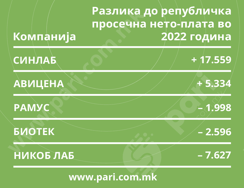 Анализата на платите ги опфаќа петте најприходни лаборатории: Авицена, Биотек, Синлаб, Никоб лаб, и Рамус.