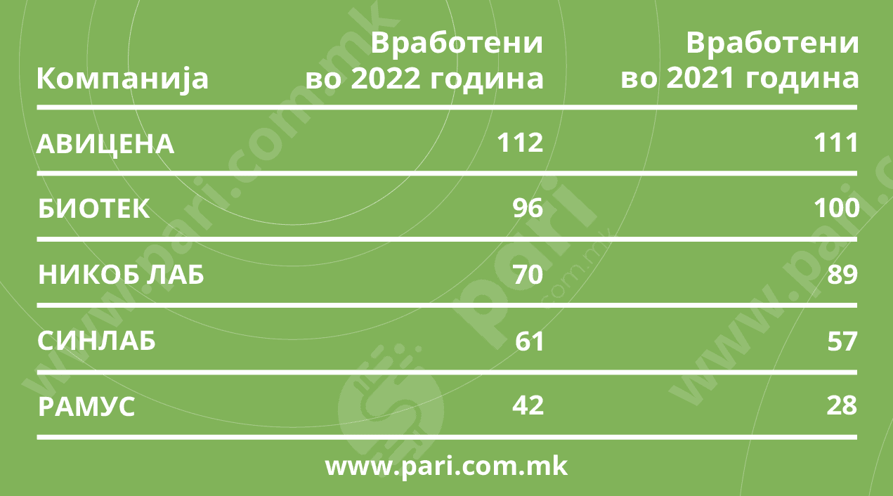 Во петте лаборатории минатата година имало 381 вработен, што е незначително намалување во однос на пандемиската 2021 година, кога работеле 385 луѓе. Сепак, раст на вработени има во Авицена (само еден повеќе), Синлаб со 4 нови вработувања, и Рамус со значително зајакнување на кадарот – од 28 вработени во 2021 година на 42 вработени во 2022 година. Биотек има мало намалување на кадарот, а во Никоб лаб позначајно.