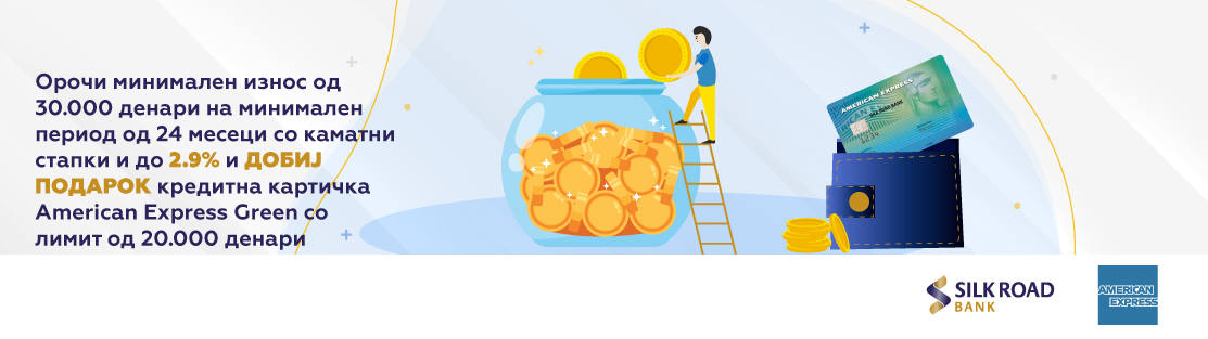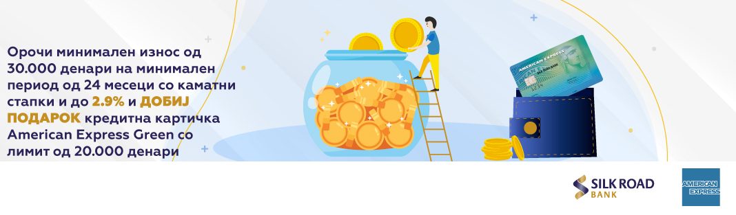 Сопственикот на новоорочен депозит (нови пари) со минимум 30.000 денари добива награда American Еxpress Green кредитна картичка со лимит од 20.000 денари. Единствениот услов е рокот на орочување да е на 24 месеци или повеќе. Каматните стапки за орочување на депозити во банката изнесуваат и до 2.9%.