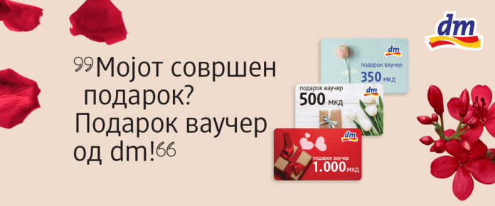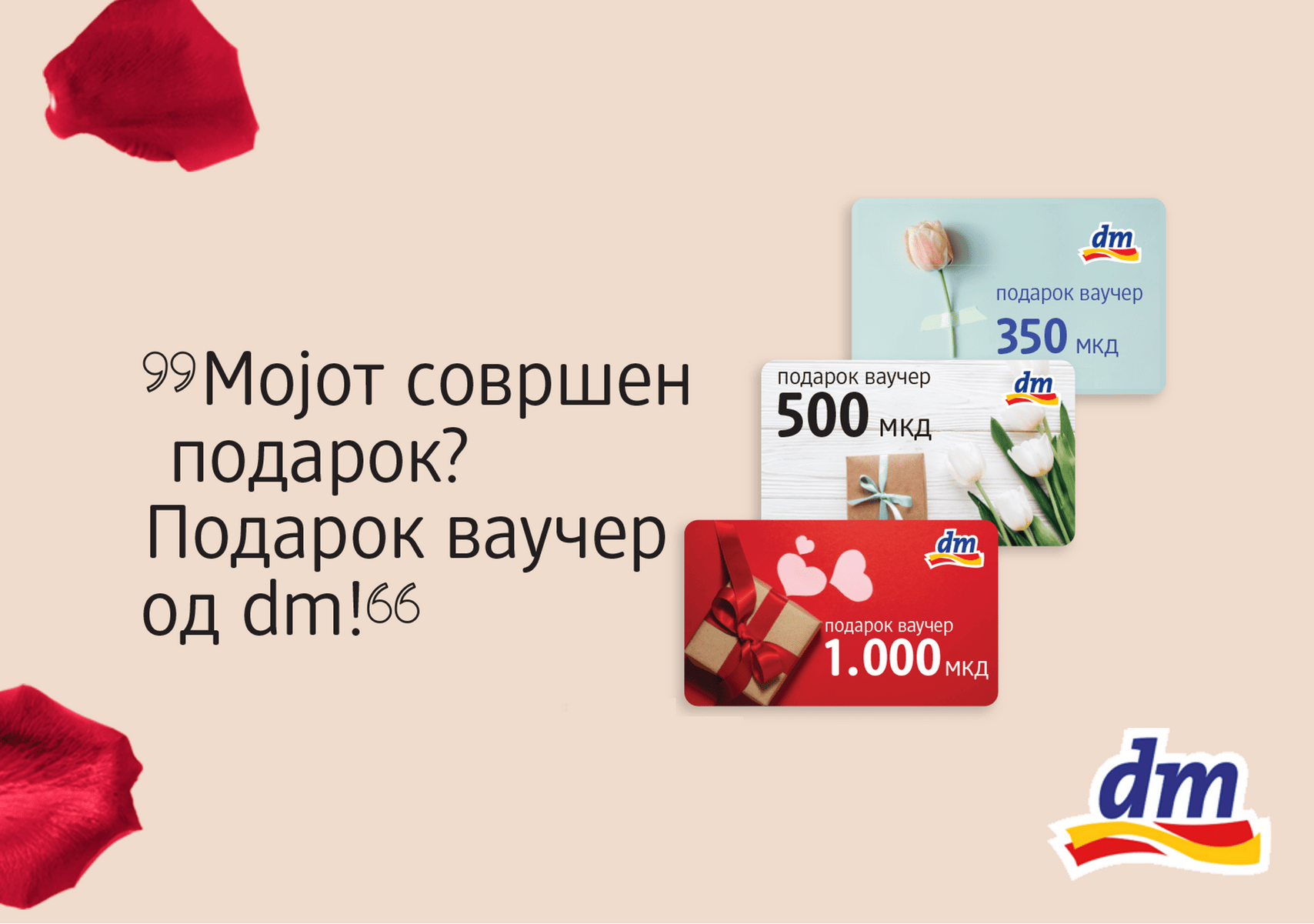 Благодарение на неговата удобност, насекаде во светот ваквиот вид на дарување е многу проширен и популарен, а благодарение на мотивите вредносните ваучери од dm совршено се вклопуваат како подарок за секоја прилика. Ваучерите може да се набават во сите dm дрогерии во вредност од 350, 500 и 1.000 денари, а сопственикот на вредносниот ваучер може да го искористи истиот како платежно средство во сите дрогерии на dm и да си ги набави своите омилени производи.