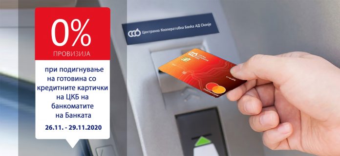Централна кооперативна Банка АД Скопје ги известува своите клиенти дека во периодот од 26.11.2020 год. до 29.11.2020 год. подигнувањето на готовина со вашите ЦКБ кредитни картички за физички лица, на банкоматите на Банката – ќе биде без провизија!