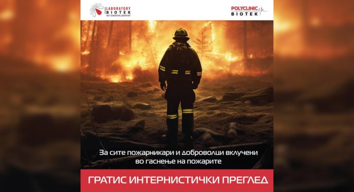 Бесплатен интернистички преглед за сите учесници во гаснењето на пожарите кои изминатиов период ја зафатија нашата земја нуди ПОЛИКЛИНИКА БИОТЕК. Македонија речиси два месеца се бори со пожарите на отворено.