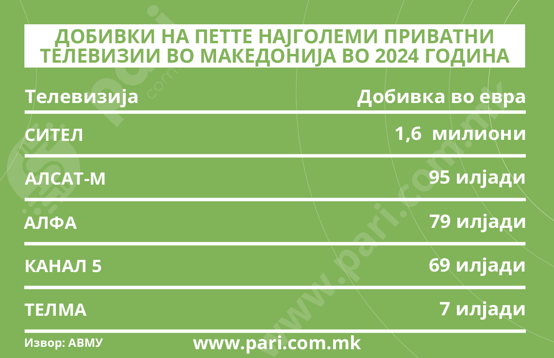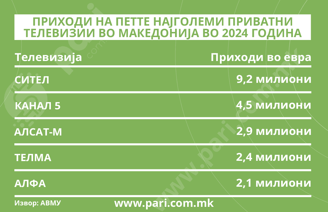 Лидер на пазарот останува Сител со приходи од 566,3 милиони денари (9,2 милиони евра), што претставува 43% од вкупниот колач. Канал 5 се позиционира на второто место со 281,8 милиони денари (4,5 милиони евра). Алсат-М оствари 180,63 милиони денари (2,9 милиони евра), Телма инкасираше 152,61 милиони денари (2,4 милиони евра), а Алфа заврши со 135,1 милиони денари (2,1 милиони евра).