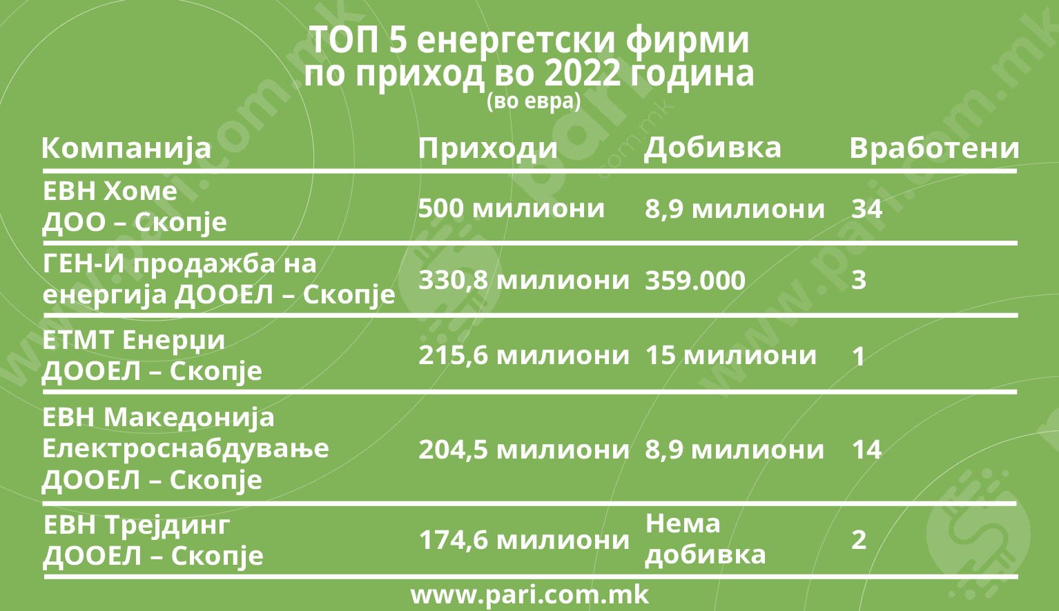 На второ место по приход во енергетскиот сектор е трговецот со струја ГЕН-И продажба на енергија ДООЕЛ Скопје. Практично, тој е најголемиот трговец со струја на компаниите во Македонија и направил промет од над 330 милиони евра. Големите трговци со струја вообичаено имаат мал број вработени, а овој имал само три, кои лани создале добивка од над 350.000 евра, што е слично како и во 2021 година.