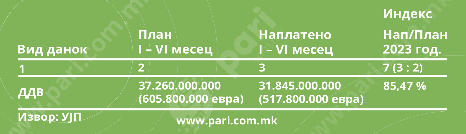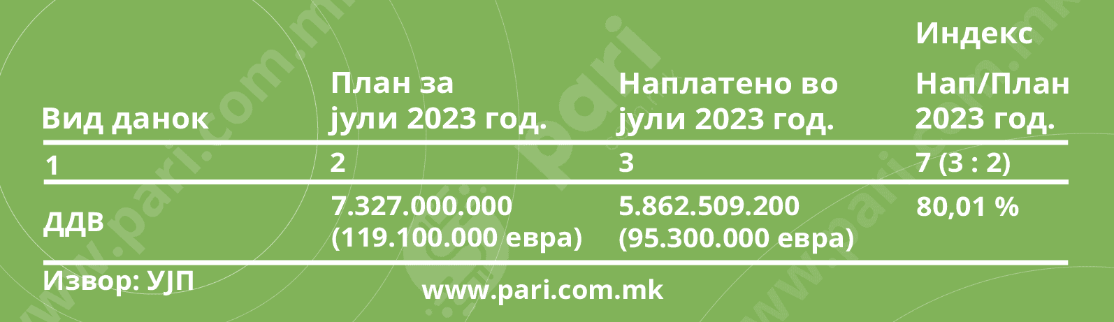 Во јули 2023 година продолжи трендот на помалку плаќање на данокот на додадена вредност, што беше присутен во првото полугодие од годинава. Минатиот месец, според податоците на Управата за јавни приходи, наплатени се речиси 24 милиони евра помалку од планираното за јули.