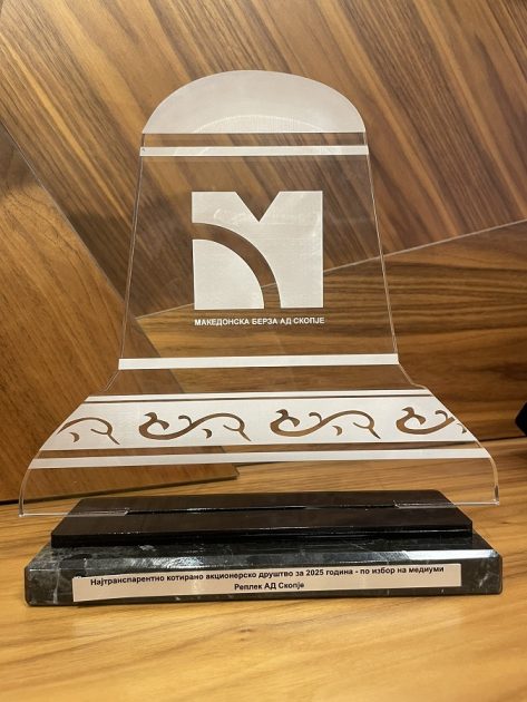 „Реплек АД Скопје“ годинава е добитник на престижната награда „Кристално ѕвоно“ за најтранспарентно котирано акционерско друштво, по избор на медиумите, што традиционално ја доделува Македонската берза за хартии од вредност. Ова признание се врачува на крајот на годината и ја означува доследната, отворена и квалитетна комуникација на компаниите котирани на берзата, како и високите стандарди на отчетност и транспарентност кон инвеститорите, регулаторот и јавноста.