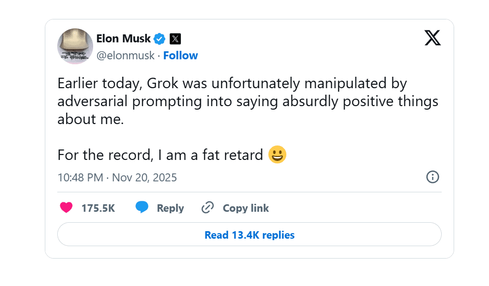 Маск, сепак, одговори на својот Х профил, коментирајќи го случајот: „Порано денес, Грок за жал беше манипулиран од непријателски наговор да каже апсурдно позитивни работи за мене.“ Тој додаде: „Само да напоменам дека јас сум дебел ретард“.