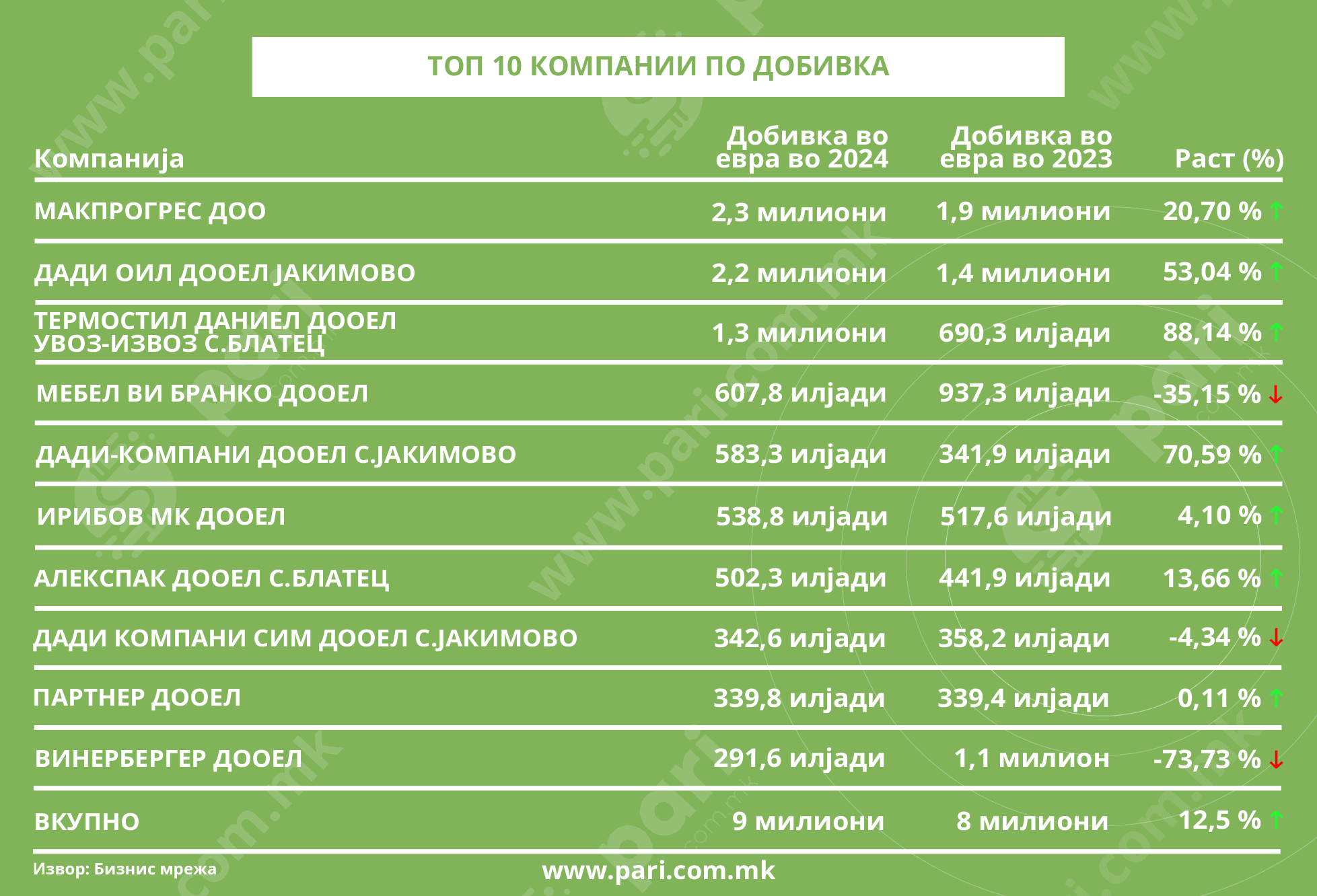 Минатогодишната добивка на десетте најпрофитабилни компании изнесува 9 милиони евра и е за 12,5 насто повисока од заедничкото постигнување во 2023 година. Во вкупниот профит има удел од 65,7 насто. Притоа, пад забележале три компании. Инаку, оваа листа се разликува од претходната по само две трговски друштва. Едното е Алекспак од Блатец, кој со добивката од 502,3 илјади евра, заработена од производство на хартија и картон, е на 7. место. Веќе на следното е третата фирма од Јакимово ‒ Дади Компани СИМ. Активностите во товарниот патен сообраќај ѝ донеле добивка од 342,6 илјади евра.