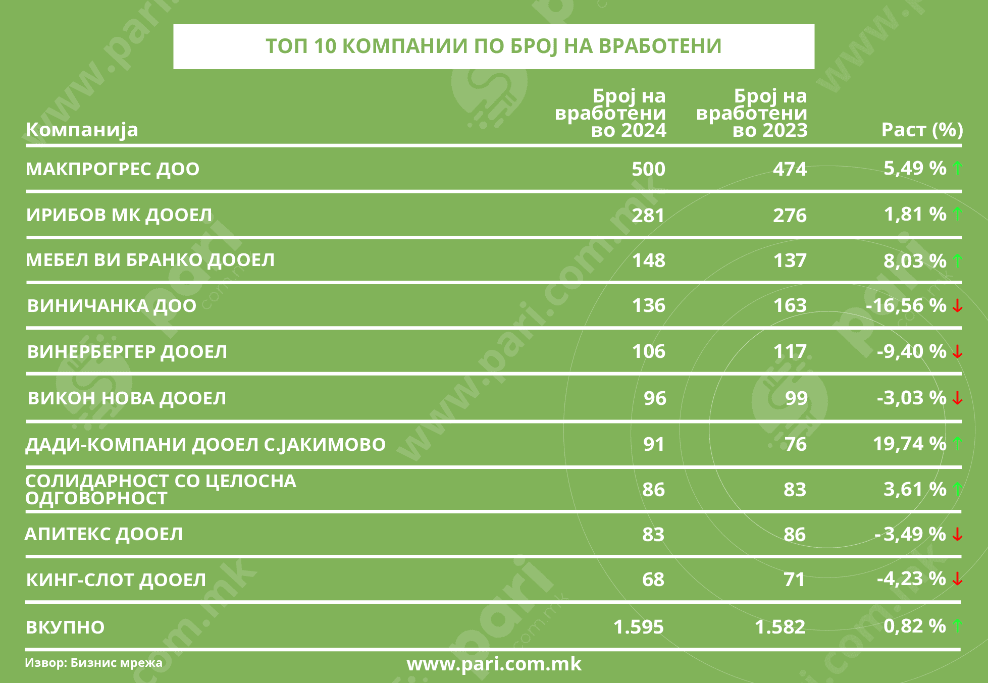 Најголемите можности за работа ги има во Макпрогрес, кадешто плата лани примале 500 лица (+ 5,5 %). Во првата половина од листата уште четири компании функционираат со повеќе од сто вработени, со тоа што кај две екипираноста е зголемена ‒ Ирибов МК (+ 1,81 %) и Мебел ВИ Бранко (+ 8,03 %), а кај другите две има одлив на кадарот – Виничанка (‒ 16,56 %) и Винербергер (‒ 9,4 %).