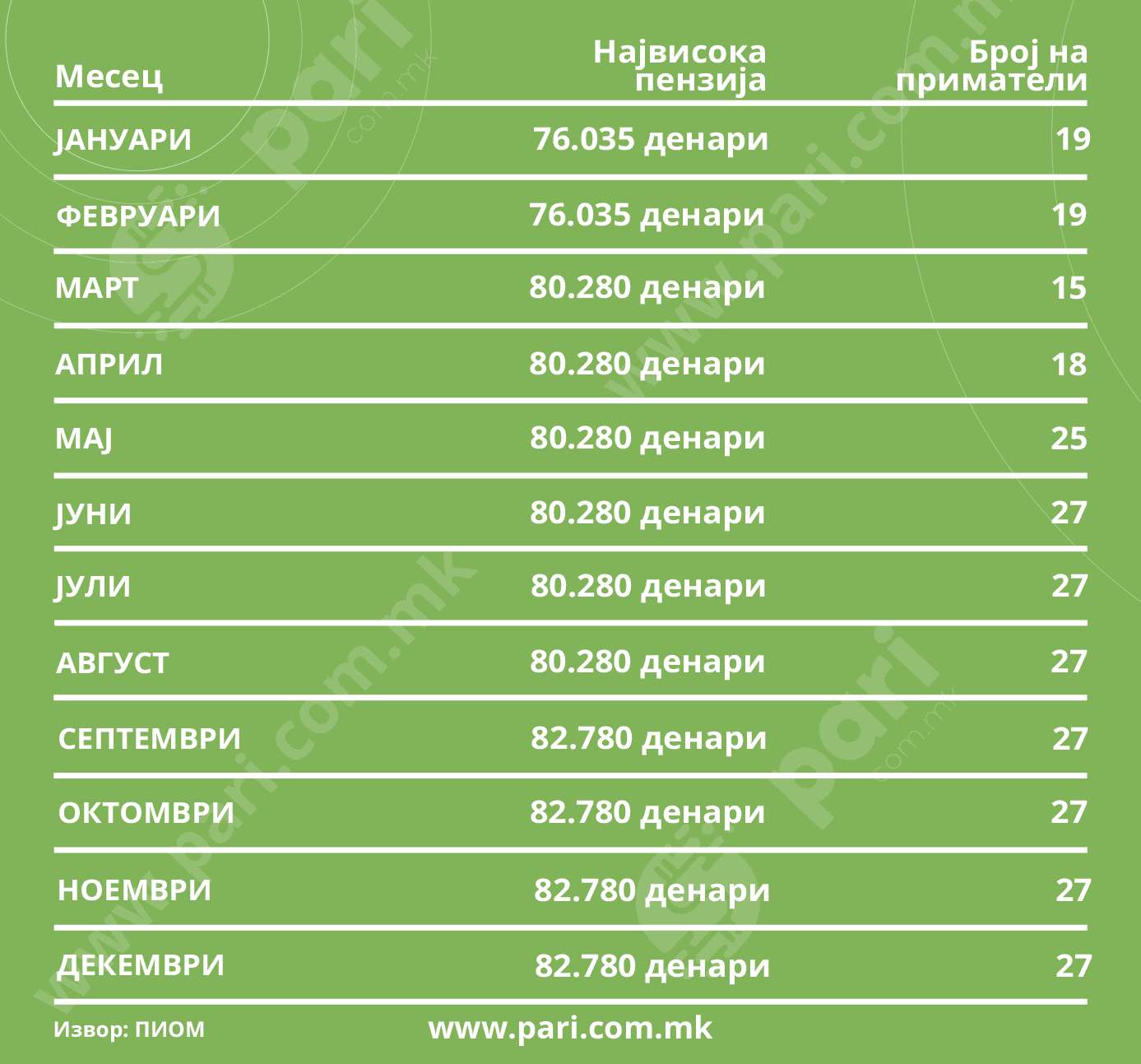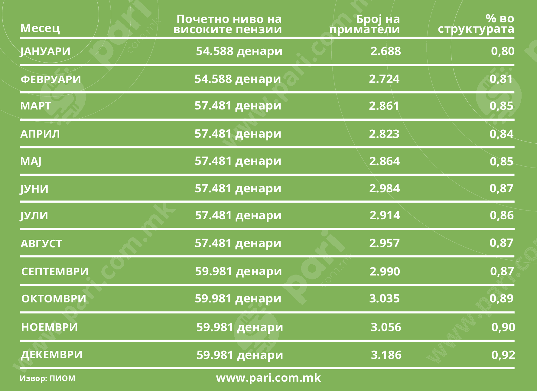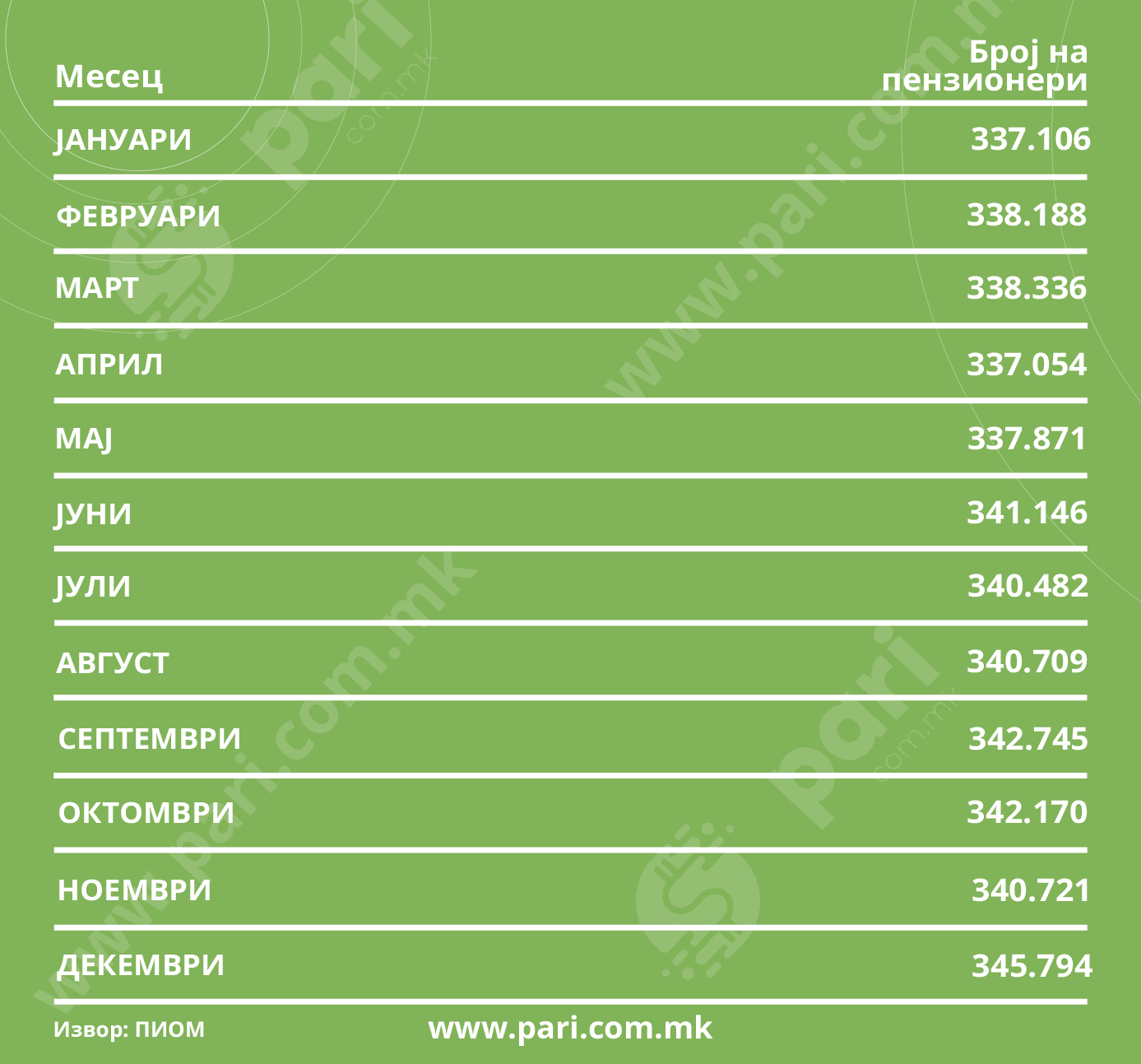 Што се однесува до пензионерите, нивото се одржува над 330 илјади. Според податоците од ПИОМ, бројот на корисниците на кои им била исплатена пензија бил најнизок во април – 337.054, додека највисокиот е забележан во декември – 345.794.