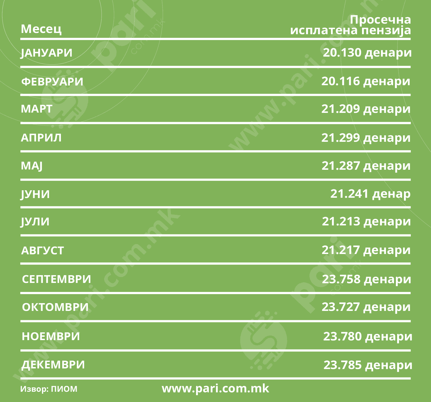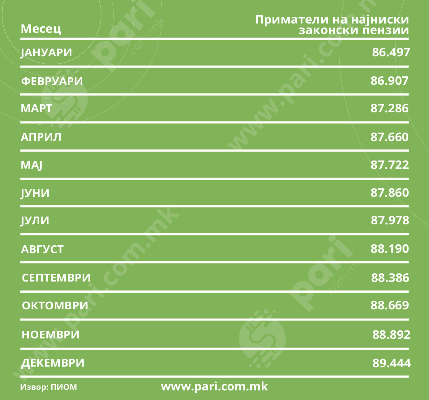 Најниските законски пензии во првите два месеци од минатата година беа во опсег од 12.528 до 16.058 денари. По нивното нивелирање во март се движеа од 13.192 до 16.909 денари. А, од септември се зборува за износи од 15.692 до 19.409 денари. Предодредени на овие примања се речиси 90 илјади пензионери. Или, бидејќи бројките имаат месечни промени, со тие пари месеците се принудени да ги врзуваат од над 86 до над 89 илјади наши сограѓани.
