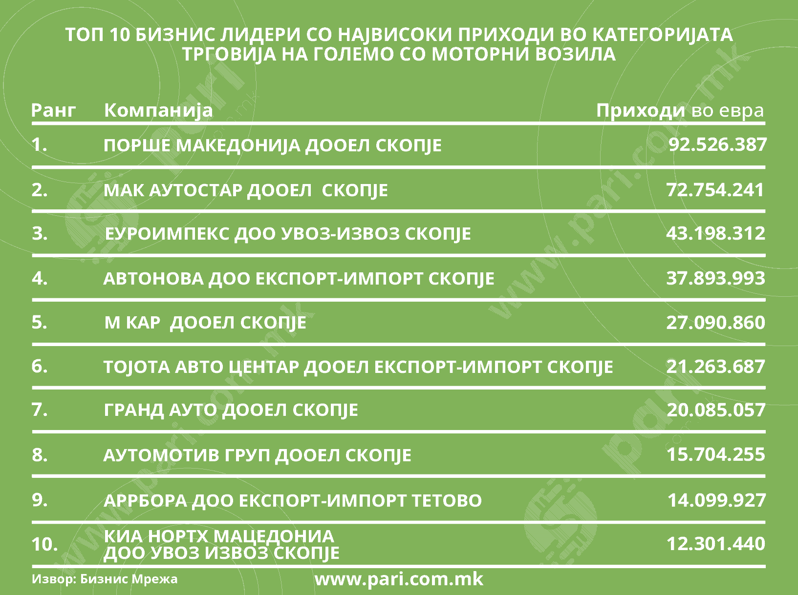Порталот Пари во соработка со Бизнис мрежа анализира кои автомобили биле најпродавани и колку заработиле ТОП десетте бизнис-лидери во трговија на големо со моторни возила.