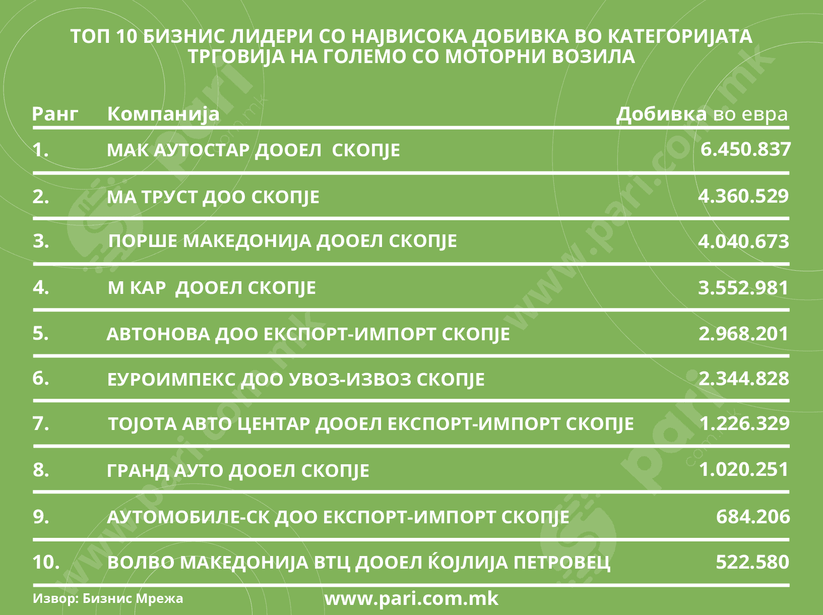 Вкупната заработка на бизнис-лидерите во категоријата трговија на големо со моторни возила изнесува околу 27 милиони евра. Сепак, кога станува збор за тоа кој направил најголема заработка, прворангиран е застапникот на мерцедес. Мак Аутостар има остварено заработка од 6,4 милиони евра.