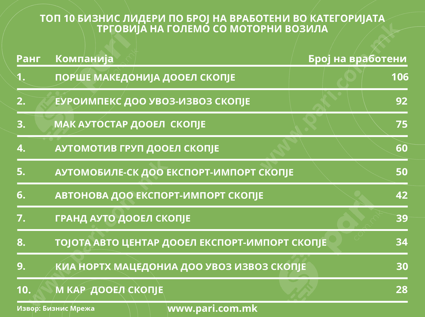 Најголем работодавач во трговијата на големо со моторни возила е Порше Македонија. Оваа компанија брои 106 вработени. Зад него следи Еуроимпекс со 92 вработени, додека, пак, на трето место е рангиран Мак Аутостар, каде што за леб заработуваат 75 луѓе. Останатите компании бројат од 28 до 60 вработени.
