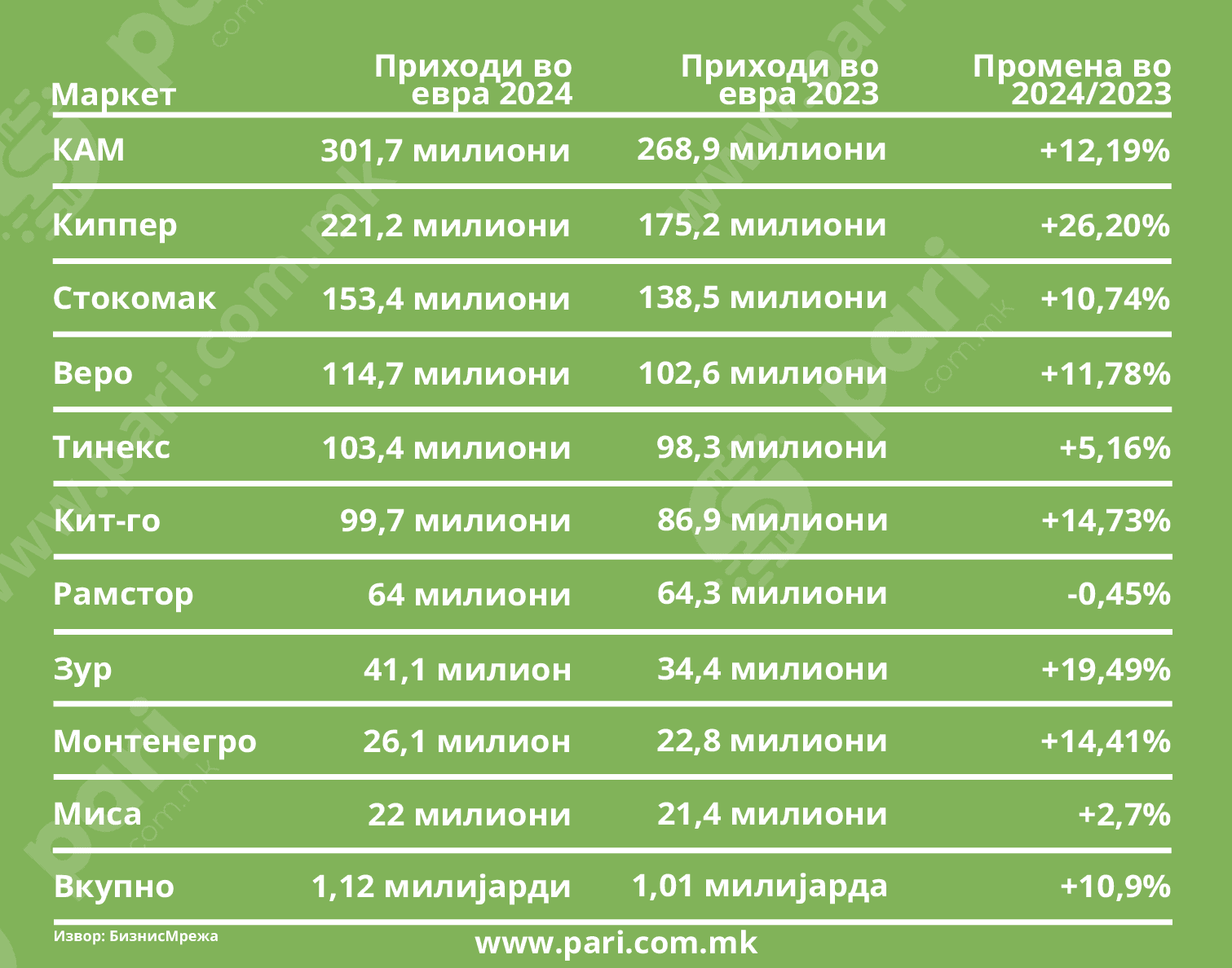 Цврста е водечката позиција на КАМ маркети со најголемите остварени приходи од 301,7 милиони евра. На второто место е Киппер маркет со 221,2 милиони евра, но оваа компанија е убедливо прва според годишниот раст на приходите од дури 26,2%.