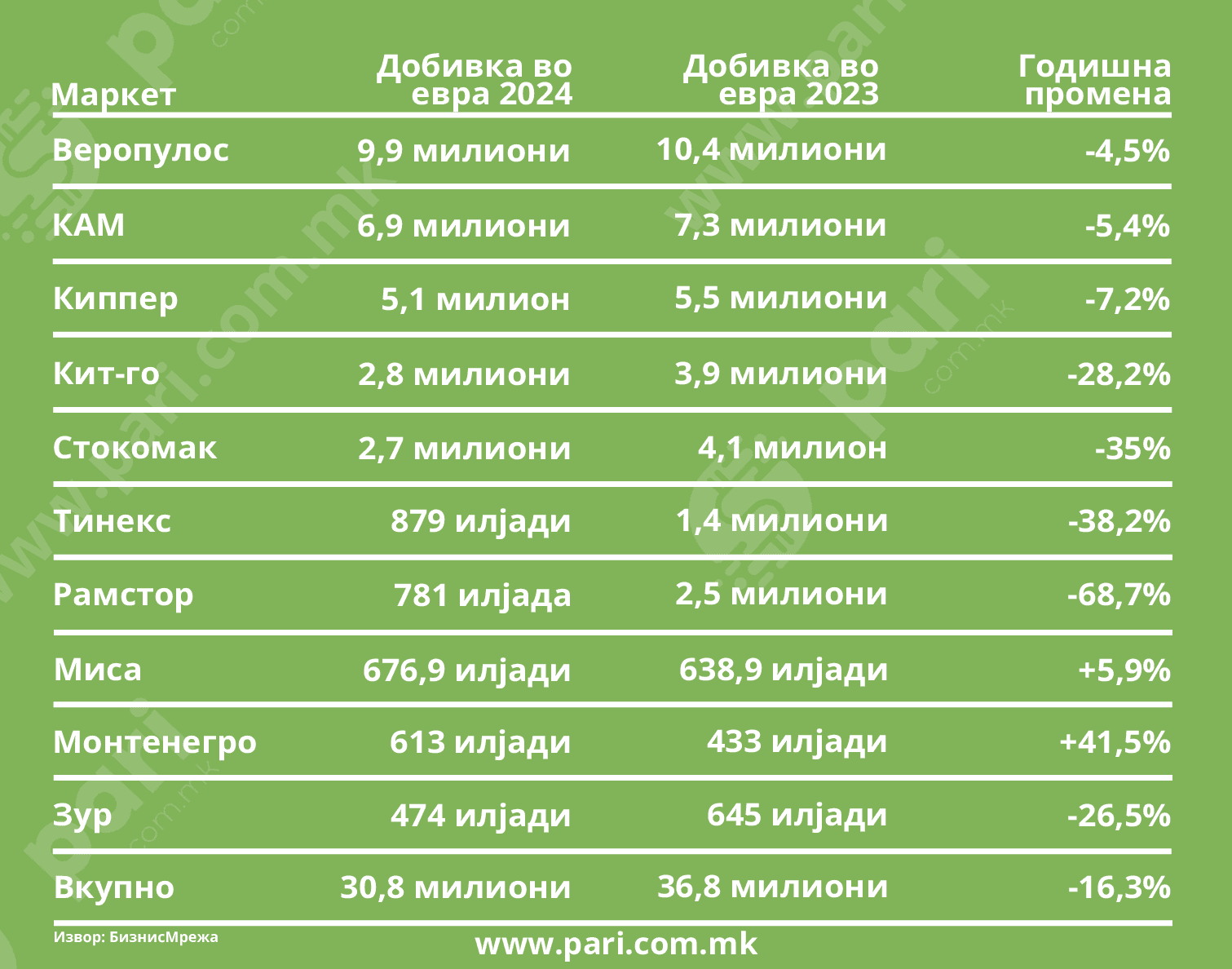 Подобро минале Кипер маркет, со намален профит од 7,2 проценти (од 5,5 милиони евра на 5,1 милион евра), и КАМ ДОО, со минус од 5,4 отсто, чија добивка од 7,3 во 2023 г. лани опаднала на 6,9 милиони евра. Лидерот на табелата според висината на остварената добивка, Веропулос ДООЕЛ, исто така има намален профит, за 4,5 отсто ‒ од 10,4 милиони на 9,9 милиони евра.