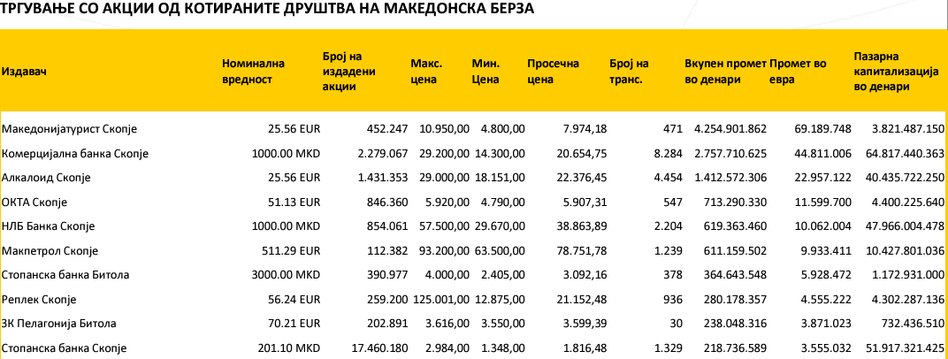 Инаку, на оваа листа се наведени податоците на 34 друштва, кои во текот на минатата година забележале промет од над еден милион денари. Под таа граница се сите останати, со заеднички 118 трансакции, промет од 5.737.183 денари, односно 93.271 евро и пазарна капитализација од 29.004.532.854 денари или 471,6 милиони евра.