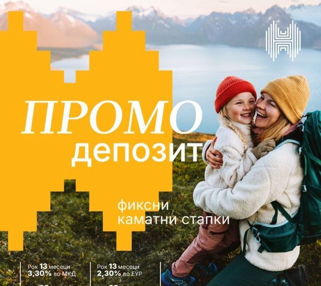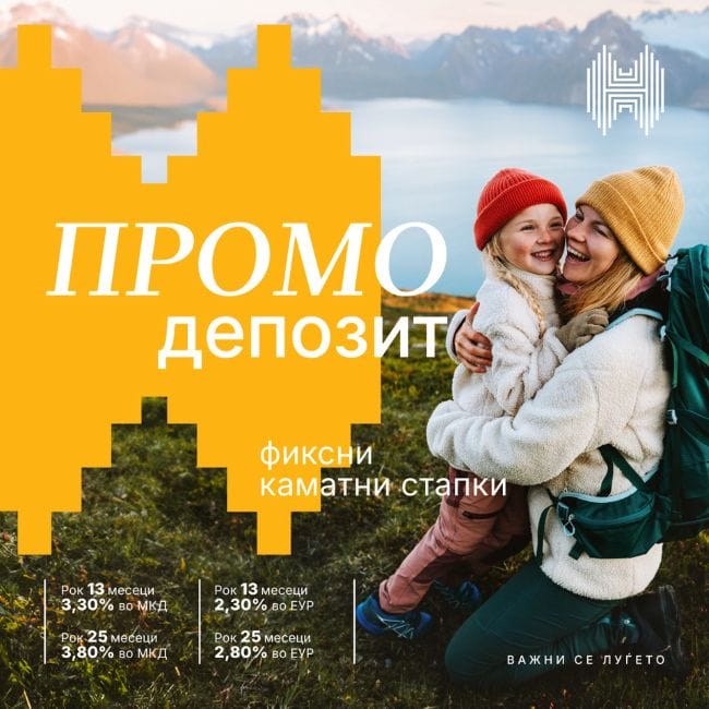 Со почетен влог од 30.000 денари или 500 евра, Промо депозитот е достапен за секој кој планира да инвестира во својата иднина. Изберете го периодот на орочување што најдобро одговара на вашите планови – 13 или 25 месеци, со привлечни фиксни каматни стапки што гарантираат сигурен принос. На пример, за рок на орочување од 13 месеци, годишната каматна стапка е 3,30% за депозити во МКД и 2,30% за депозити во ЕУР, додека за 25 месеци овие стапки достигнуваат 3,80% за МКД и 2,80% за ЕУР.