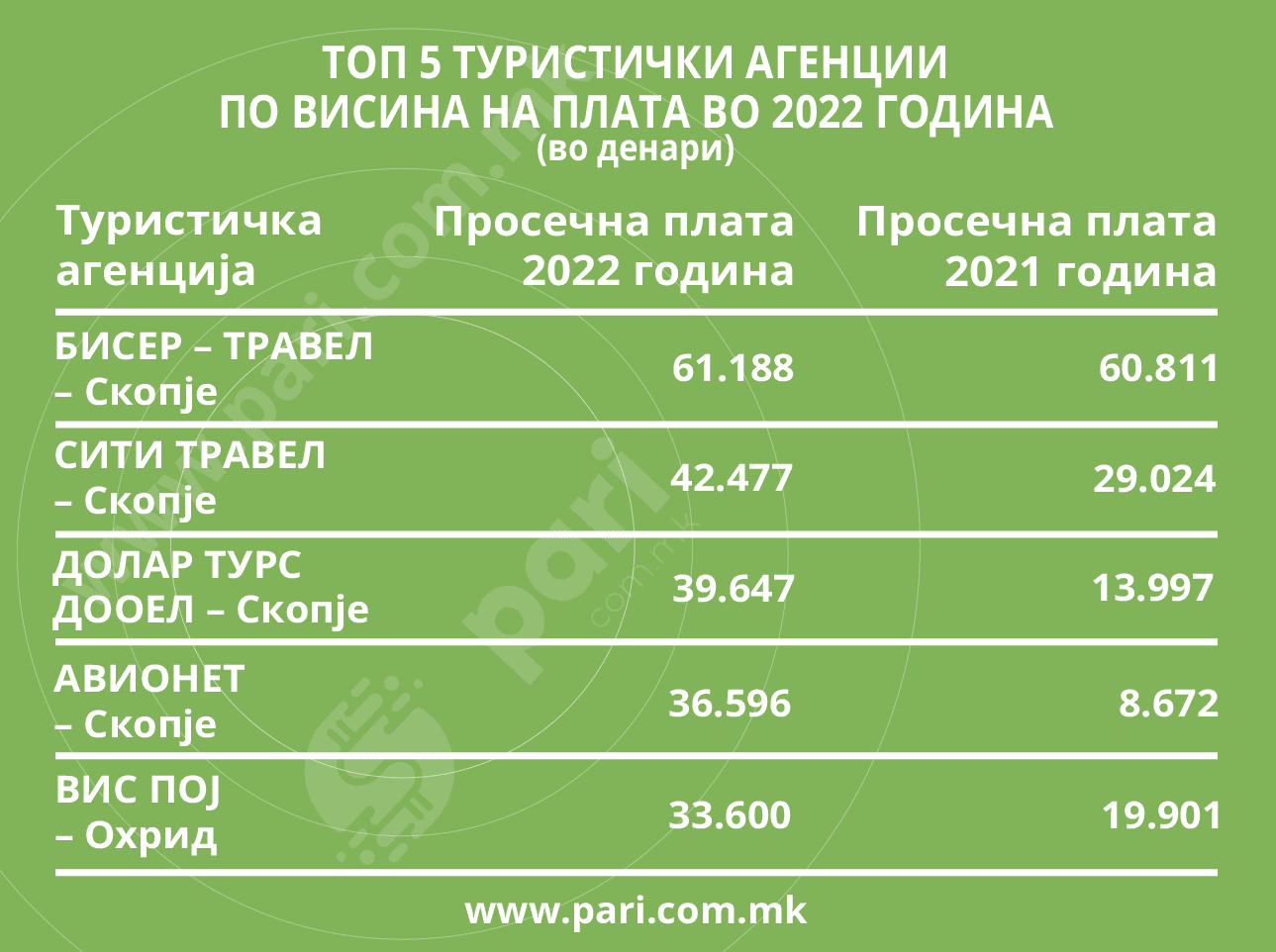Интересен факт е што ниту една од туристичките агенции што имаат најмногу вработени не е во групата на оние што даваат највисоки плати. Минатата година платите во петте туристички агенции со највисока плата биле од 33.600 до 61.188 денари. Притоа, платите во туристичките агенции што биле најдарежливи кон своите вработени, покажале значителен раст во однос на 2021 година (освен Бисер травел, каде имало умерен раст). Зборуваме за раст на плати од 300, па и од речиси 400 проценти!