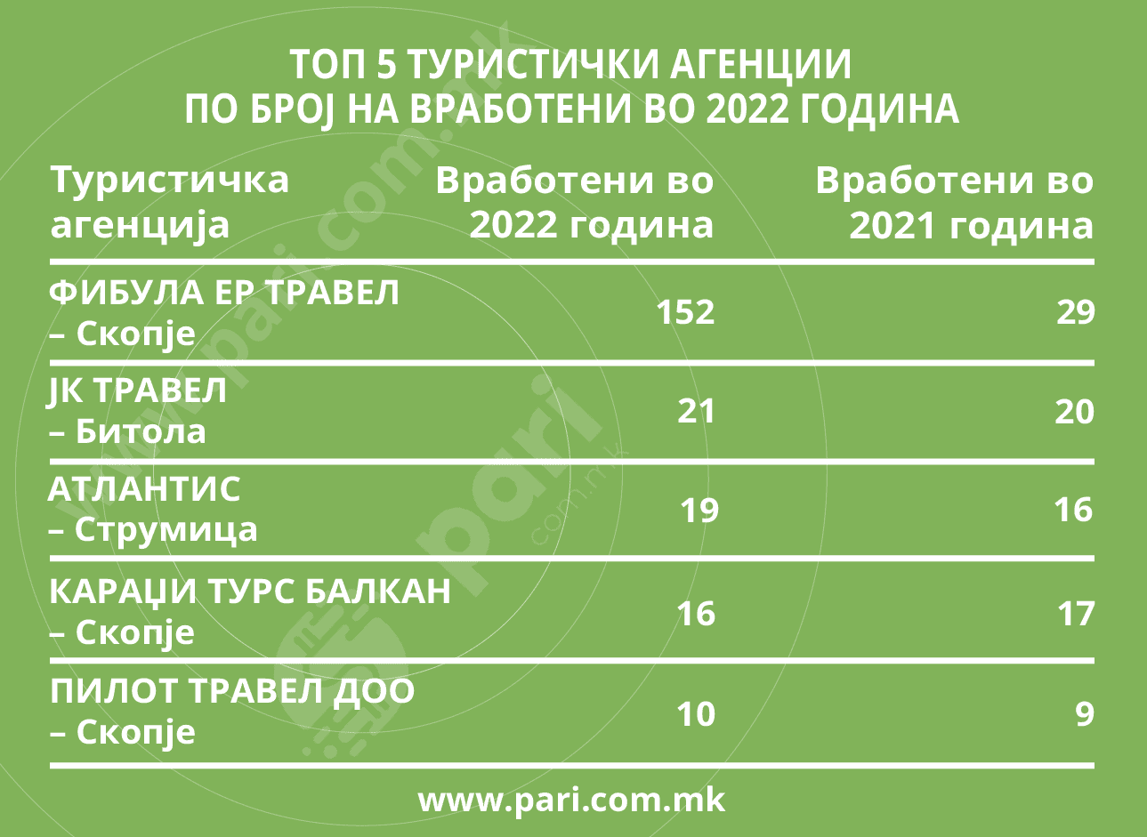ТОП 5 туристички агенции по број на вработени во 2022 година