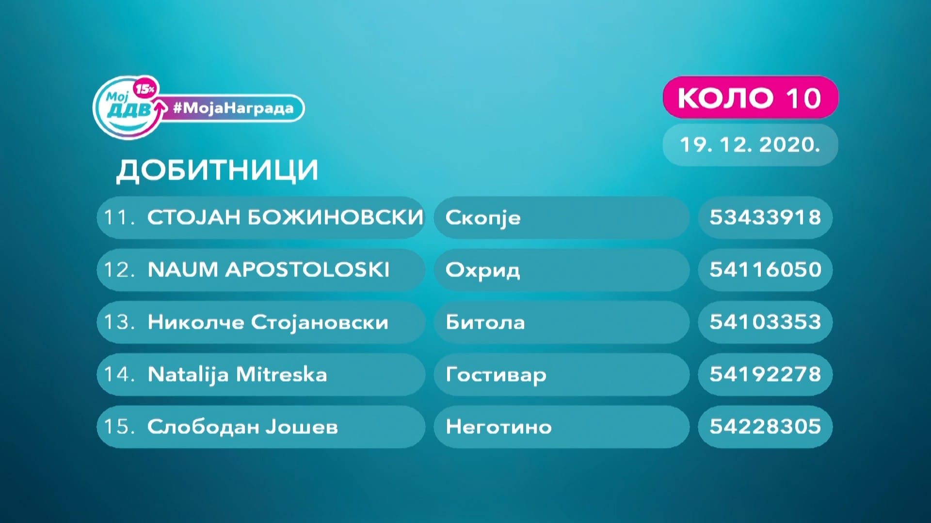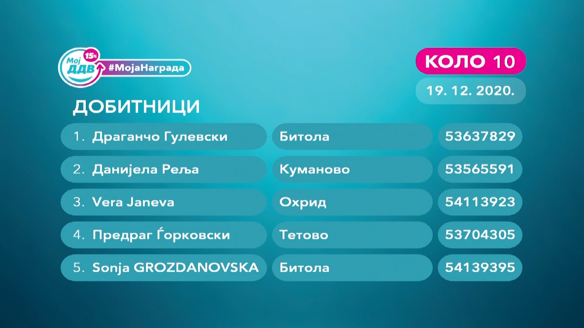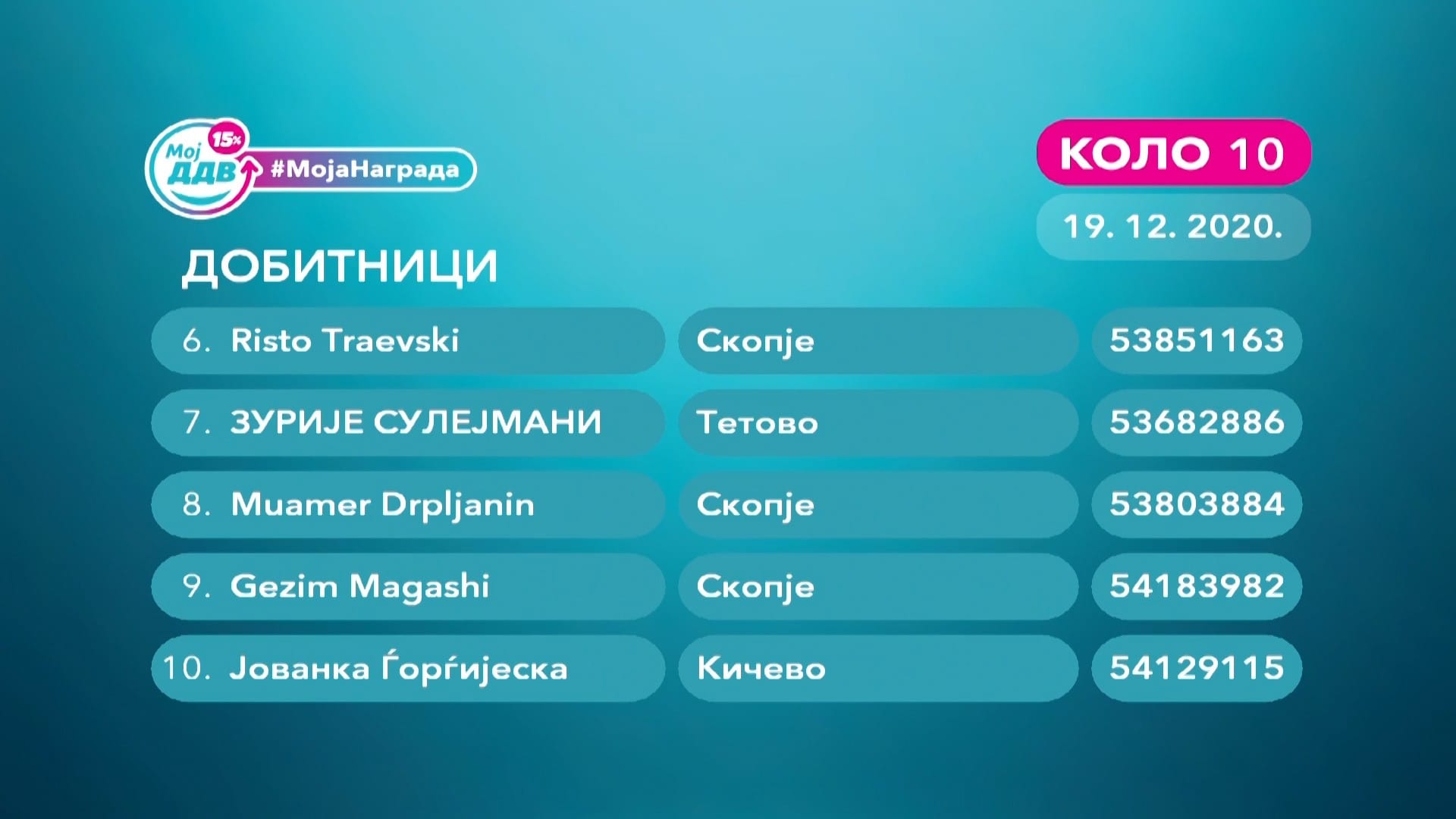 Сите оние кои скенираа сметки преку Мој ДДВ во саботата имаа можност да го гледаат извлекувањето на последните месечни награди од по 20.000 денари но и главната премија од 1.000.000 денари која заврши во рацете на Зоран Фурнаџиски од Берово.